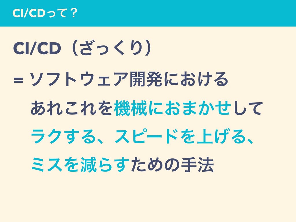 CI/CDͬͯʁ CI/CDʢͬ͘͟Γʣ = ιϑτΣΞ։ൃʹ͓͚Δ ɹ͋Ε͜ΕΛػցʹ͓·͔ͤͯ͠ ɹϥΫ͢ΔɺεϐʔυΛ্͛Δɺ ɹϛεΛݮΒͨ͢Ίͷख๏ ɹ