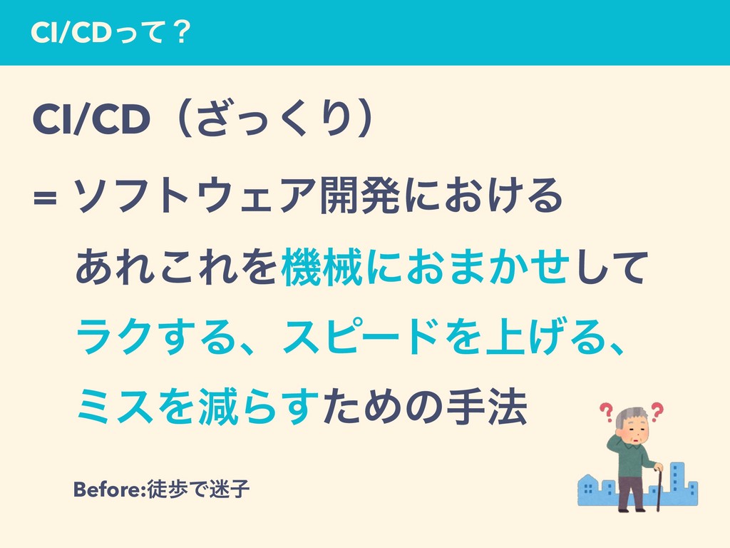 CI/CDͬͯʁ CI/CDʢͬ͘͟Γʣ = ιϑτΣΞ։ൃʹ͓͚Δ ɹ͋Ε͜ΕΛػցʹ͓·͔ͤͯ͠ ɹϥΫ͢ΔɺεϐʔυΛ্͛Δɺ ɹϛεΛݮΒͨ͢Ίͷख๏ ɹBefore:ెาͰ໎ࢠ