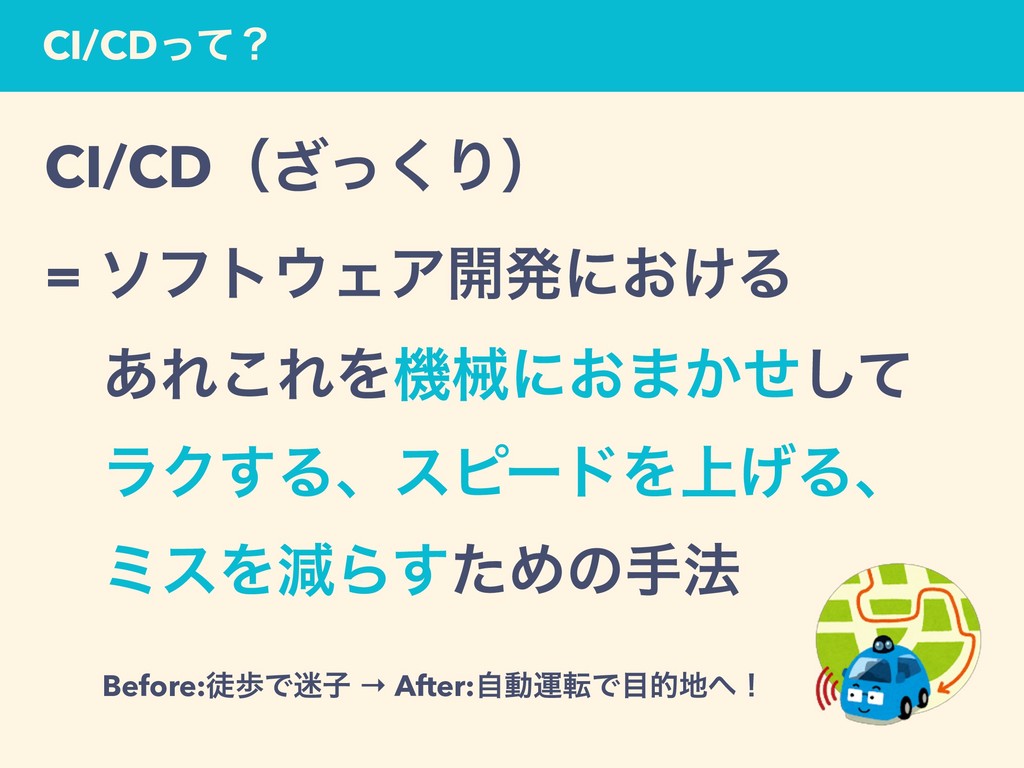 CI/CDͬͯʁ CI/CDʢͬ͘͟Γʣ = ιϑτΣΞ։ൃʹ͓͚Δ ɹ͋Ε͜ΕΛػցʹ͓·͔ͤͯ͠ ɹϥΫ͢ΔɺεϐʔυΛ্͛Δɺ ɹϛεΛݮΒͨ͢Ίͷख๏ ɹBefore:ెาͰ໎ࢠ → After:ࣗಈӡసͰతʂ