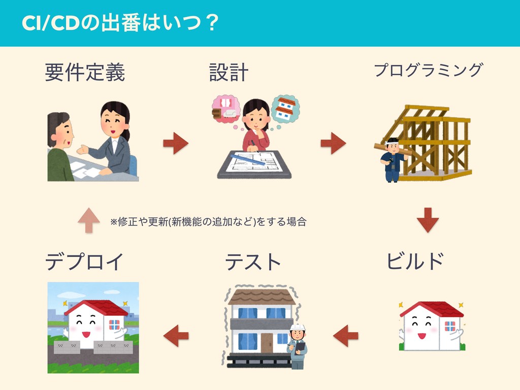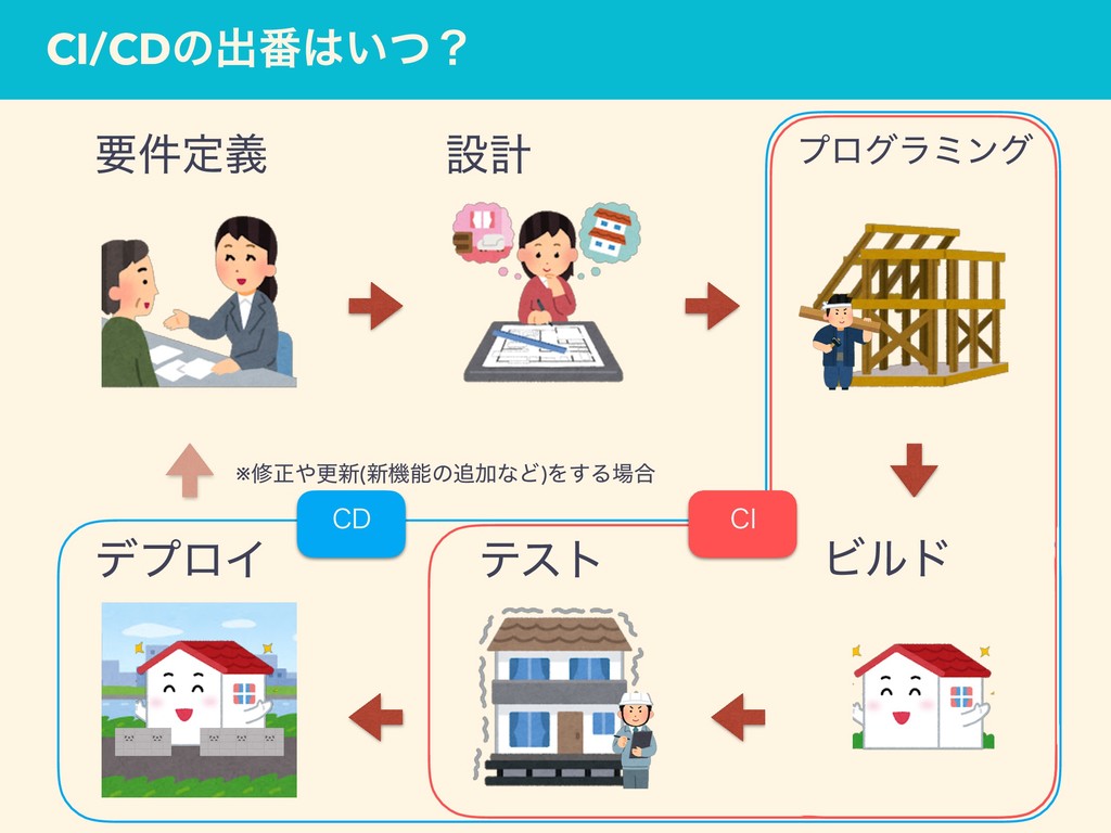 CI/CDͷग़൪͍ͭʁ ཁ݅ఆٛ ઃܭ ϓϩάϥϛϯά ςετ σϓϩΠ Ϗϧυ ※मਖ਼ߋ৽(৽ػೳͷՃͳͲ)Λ͢Δ߹