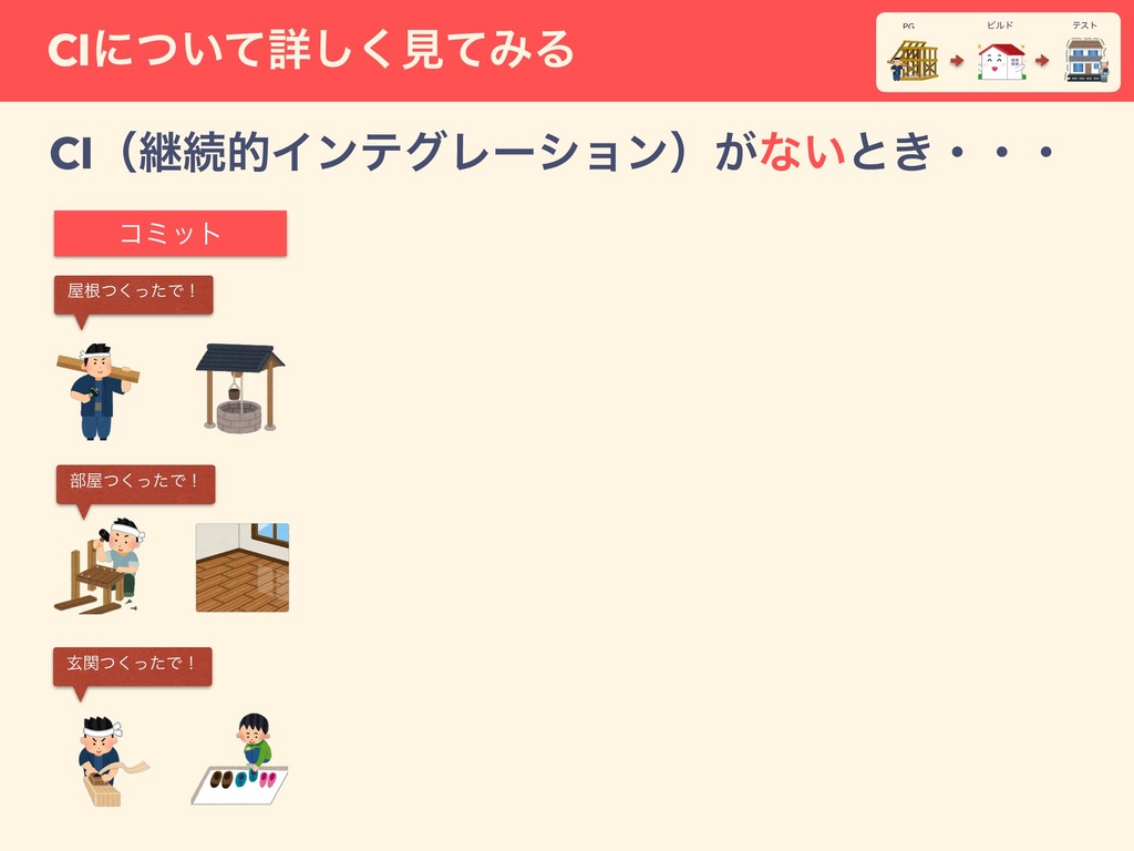 CIʹ͍ͭͯৄ͘͠ݟͯΈΔ PG ςετ Ϗϧυ ෦ͭͬͨ͘Ͱʂ ࠜͭͬͨ͘Ͱʂ ݰؔͭͬͨ͘Ͱʂ CIʢܧଓతΠϯςάϨʔγϣϯʣ͕ͳ͍ͱ͖ɾɾɾ ίϛοτ