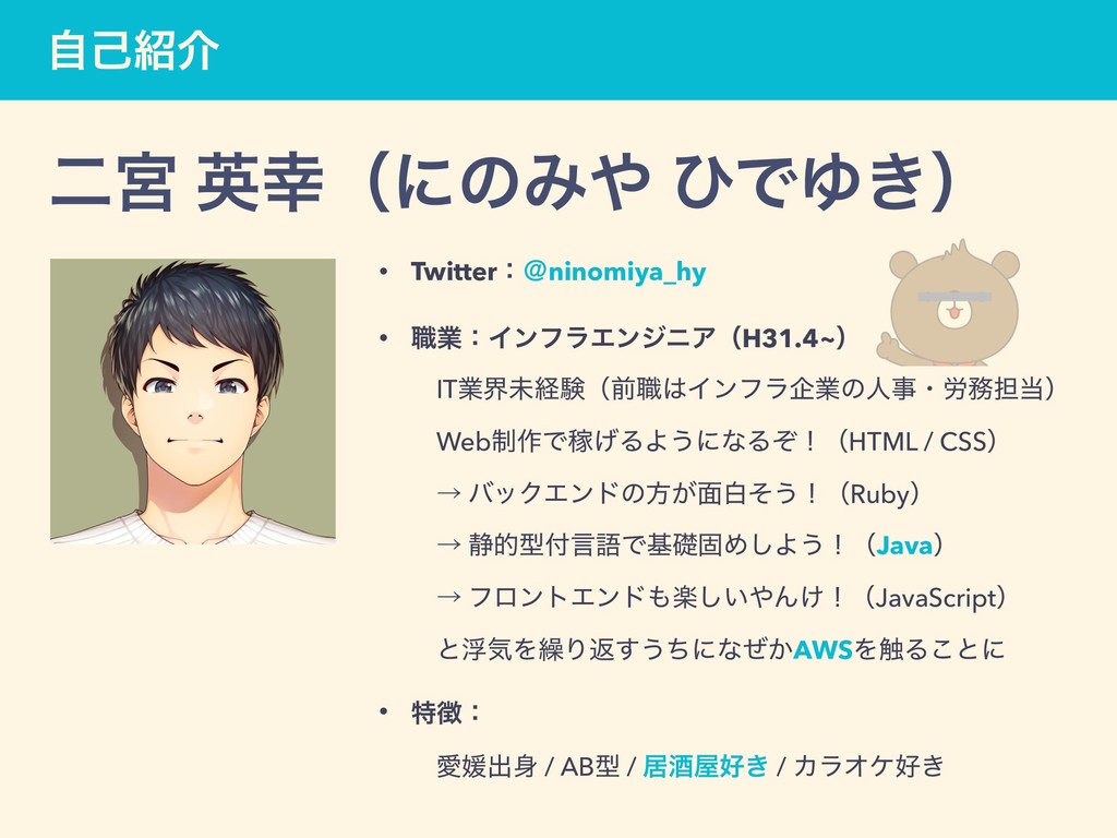 ࣗݾհ ೋٶ ӳʢʹͷΈ ͻͰΏ͖ʣ • Twitterɿˏninomiya_hy • ৬ۀɿΠϯϑϥΤϯδχΞʢH31.4~ʣ ɹ ɹITۀքະܦݧʢલ৬Πϯϑϥاۀͷਓࣄɾ࿑୲ʣ