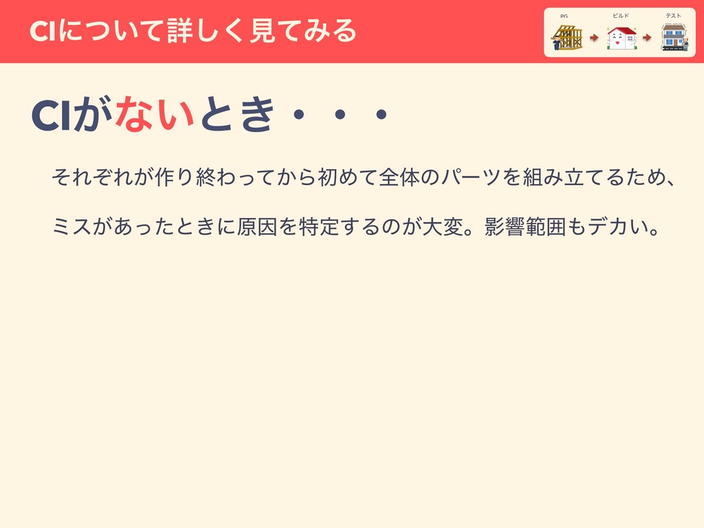 CI͕ͳ͍ͱ͖ɾɾɾ ɹͦΕͧΕ͕࡞ΓऴΘ͔ͬͯΒॳΊͯશମͷύʔπΛΈཱͯΔͨΊɺ ɹϛε͕͋ͬͨͱ͖ʹݪҼΛಛఆ͢Δͷ͕େมɻӨڹൣғσΧ͍ɻ CI͕͋Δͱ͖ʂ ɹҰਓ͕࡞ΓऴΘΔɺࣗಈͰύʔπΛΈཱͯͯ͘ΕΔͨΊɺ ɹϛε͕͋ͬͨΒ͙͢ʹ͔Δ͠ɺӨڹൣғ͕খ͍͞͏ͪʹͤΔɻ ɹɺࣗಈͰΈཱͯΔɹʹɹܧଓతΠϯςάϨʔγϣϯʢ౷߹ʣ CIʹ͍ͭͯৄ͘͠ݟͯΈΔ PG ςετ