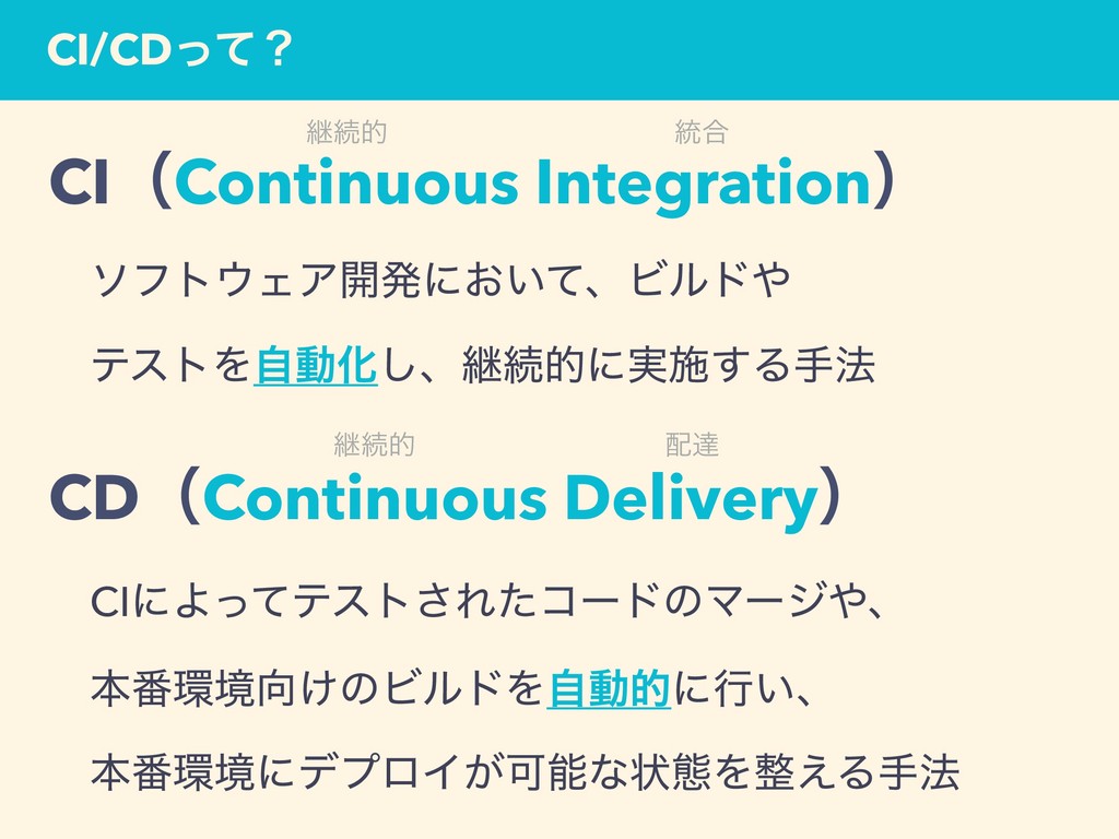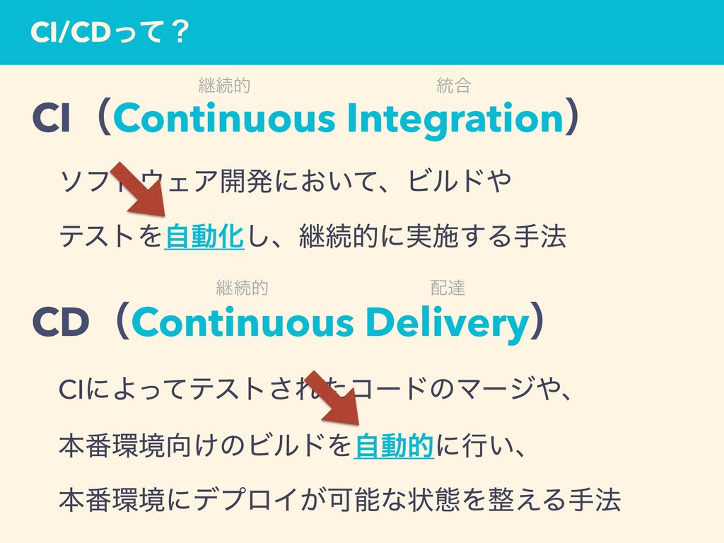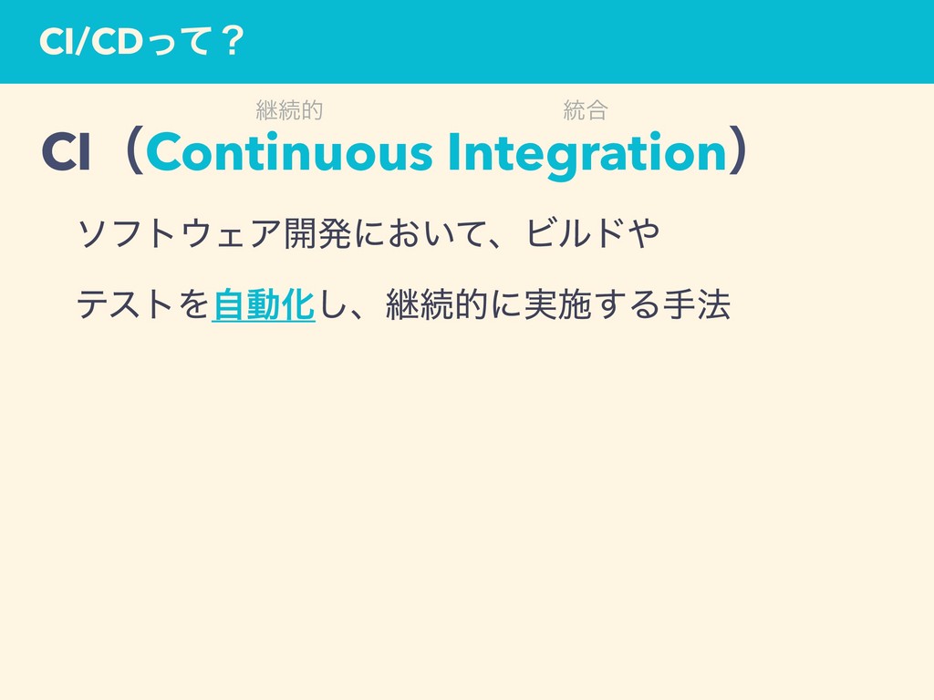 CI/CDͬͯʁ ܧଓత ౷߹ ܧଓత ୡ CIʢContinuous Integrationʣ ɹιϑτΣΞ։ൃʹ͓͍ͯɺϏϧυ ɹςετΛࣗಈԽ͠ɺܧଓతʹ࣮ࢪ͢Δख๏ CDʢContinuous