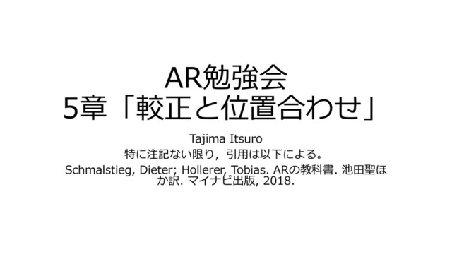 AR勉強会 5章「較正と位置合わせ」 Tajima Itsuro 特に注記ない限り,引用は以下による。 Schmalstieg, Dieter; Hollerer, Tobias. ARの教科書.