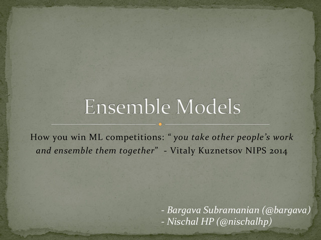 Model 3 Model 4 Combine the models using some logic Final Output pre processing feature extraction model [ [ - Pipeline identify the models Assign weights to models [ [ - Hyperopt finding randomized hyper parameters for models [ [ - RandomizedSearchCV [ [ - joblib ( running models in parallel ) sklearn keras xgboost [ [ - libraries used to build base models