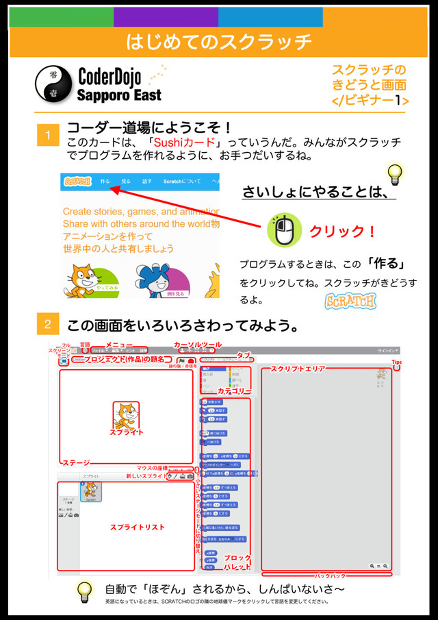 1 These Sushi Cards are going to help you learn to create computer programs in Scratch. To do this, you’re going to need to have Scratch! You can either download it and install it on your computer by going to dojo.soy/ downloadscratch or use it in your web browser by going to dojo.soy/usescratch. D one of these two and once you’re set up, move on to the next step. 2 Once you sign-in to the online Scratch, or load it on your computer, you’ll see a screen like the one below. This screen has a few parts you’ll need to remember. They are labeled in the pictur below. Stage Sprite List Code Blocks PalleGe Current Sprite Pannel Start Program Stop Program Scratch Basics GETTING STARTED Card 1 of I’m Learning: Scratc 1 These Sushi Cards are going to help you learn to create computer programs in Scratch. To do this, you’re going to need to have Scratch! You can either download it and install it on your computer by going to dojo.soy/ downloadscratch or use it in your web browser by going to dojo.soy/usescratch. Do one of these two and once you’re set up, move on to the next step. 2 Once you sign-in to the online Scratch, or load it on your computer, you’ll see a screen like the one below. This screen has a few parts you’ll need to remember. They are labeled in the picture below. Stage Current Sprite Pannel Start Program Stop Program ωίΛࣗಈͰಈ͔ͯ͠ΈΔΑ ϓϩάϥϜ ͯ͠ΈΔΑ ϏΪφʔ ΧςΰϦʔͷʮಈ͖ʯ͔Βʮ าಈ͔͢ʯϒϩοΫΛ͑ΒΜͰɺ υϥοΫˍυϩοϓ͢ΔΑ ಈ͖ͷϒϩοΫΛεΫϦϓτΤϦΞʹ͓͍ͯΈΔΑɻ ϒϩοΫΛΈ߹Θͤͯ ϓϩάϥϜΛ࡞ΔΜͩΑɻ ݟͨͱ͔Πϕϯτͱ͔ɺ ͍ΖΜͳϒϩοΫ͕͋Δ ΜͩΑɻ ϒϩοΫɺ ͣͬͱͬͯ ΧςΰϦʔͷʮ੍ޚʯʢ͍ͤ͗ΐʣ ͔ΒʮͣͬͱʯΛ͑ΒΜͰυϥοΫ ˍυϩοϓ͢ΔΑ ͜ͷͱ͖ʮาಈ͔͢ʯΛ͞ ΉΑ͏ʹ͠Α͏ ͘Γ͔͑͠ͷϒϩοΫɺ͓͍ͯΈͯͶɻ ͜ͷϒϩοΫɺ͞Μ ͩϒϩοΫΛͣʔͬͱ͘ Γ͔͑͢ΜͩΑɻ ϒϩοΫΛΫϦοΫͯ͠ ΈͯͶɻ ϘλϯΛΫϦοΫ Ͱࢭ·ΔΑɻ