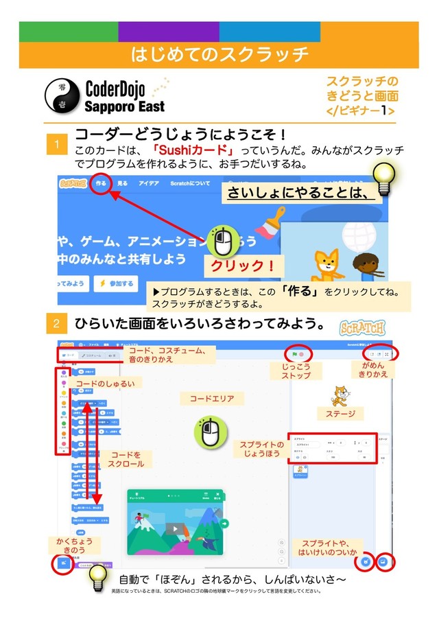 Learning: Scratch 1 These Sushi Cards are going to help you learn to create computer programs in Scratch. To do this, you’re going to need to have Scratch! You can either download it and install it on your computer by going to dojo.soy/ downloadscratch or use it in your web browser by going to dojo.soy/usescratch. Do one of these two and once you’re set up, move on to the next step. 2 Once you sign-in to the online Scratch, or load it on your computer, you’ll see a screen like the one below. This screen has a few parts you’ll need to remember. They are labeled in the picture below. Stage Sprite List Code Blocks PalleGe Current Sprite Pannel Start Program Stop Program Scratch Basics GETTING STARTED Card 1 of 7 I’m Learning: Scratch 1 These Sushi Cards are going to help you learn to create computer programs in Scratch. To do this, you’re going to need to have Scratch! You can either download it and install it on your computer by going to dojo.soy/ downloadscratch or use it in your web browser by going to dojo.soy/usescratch. Do one of these two and once you’re set up, move on to the next step. 2 Once you sign-in to the online Scratch, or load it on your computer, you’ll see a screen like the one below. This screen has a few parts you’ll need to remember. They are labeled in the picture below. Stage Current Sprite Pannel Start Program Stop Program ίʔμʔͲ͏͡ΐ͏ʹΑ͏ͦ͜ʂ ͜ͷΧʔυɺʮ4VTIJΧʔυʯ͍ͬͯ͏ΜͩɻΈΜͳ͕εΫϥον ͰϓϩάϥϜΛ࡞ΕΔΑ͏ʹɺ͓ख͍ͭͩ͢ΔͶɻ ⾣ϓϩάϥϜ͢Δͱ͖ɺ͜ͷʮ࡞ΔʯΛΫϦοΫͯ͠Ͷɻ εΫϥον͕͖Ͳ͏͢ΔΑɻ ΫϦοΫʂ ͻΒ͍ͨը໘Λ͍Ζ͍Ζ͞ΘͬͯΈΑ͏ɻ ࣗಈͰʮ΄ͧΜʯ͞ΕΔ͔Βɺ͠Μͺ͍ͳ͍͞ʙ εΫϥονͷ ͖Ͳ͏ͱը໘ ϏΪφʔ ͍͞͠ΐʹΔ͜ͱɺ ӳޠʹͳ͍ͬͯΔͱ͖ɺ4$3"5$)ͷϩΰͷྡͷٿّϚʔΫΛΫϦοΫͯ͠ݴޠΛมߋ͍ͯͩ͘͠͞ɻ ίʔυɺίενϡʔϜɺ Իͷ͖Γ͔͑ ίʔυΛ εΫϩʔϧ ίʔυͷ͠ΎΔ͍ ͔ͪ͘ΐ͏ ͖ͷ͏ εϓϥΠτͷ ͡ΐ͏΄͏ εϓϥΠτɺ ͍͚͍ͷ͍͔ͭ ͬ͜͡͏ ετοϓ ͕ΊΜ ͖Γ͔͑ εςʔδ ίʔυΤϦΞ