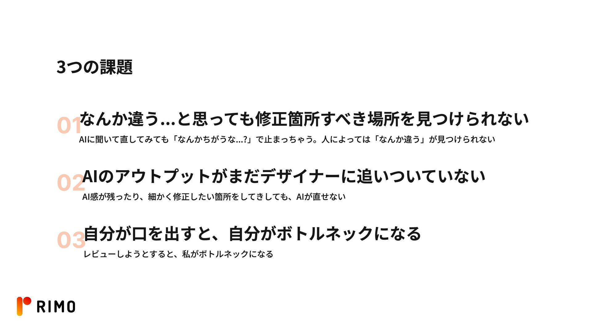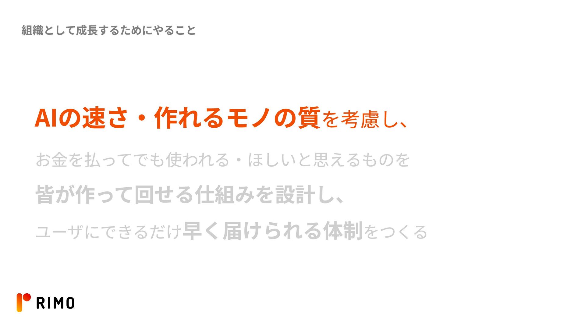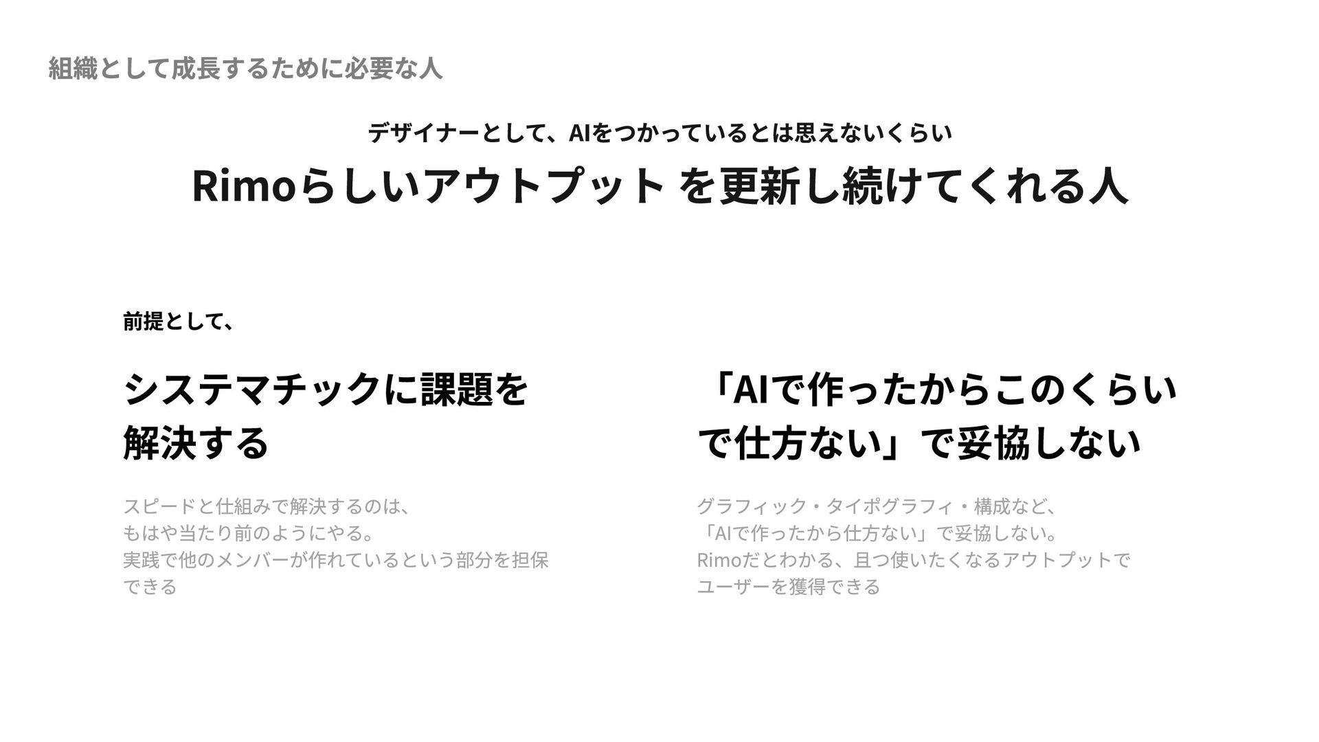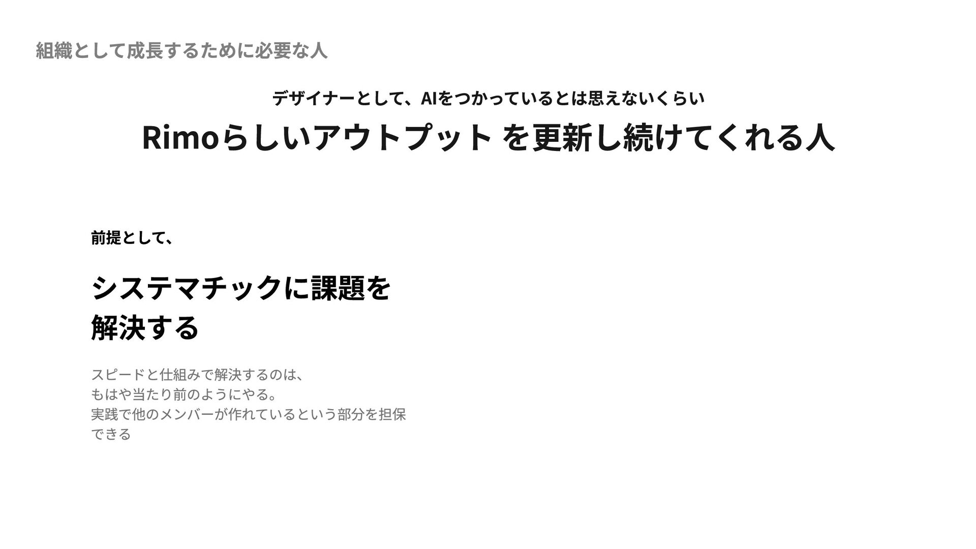 組織として成長するために必要な人 デザイナーとして、AIをつかっているとは思えないくらい Rimoらしいアウトプット を更新し続けてくれる人 前提として、 システマチックに課題を 解決する スピードと仕組みで解決するのは、 もはや当たり前のようにやる。 実践で他のメンバーが作れているという部分を担保