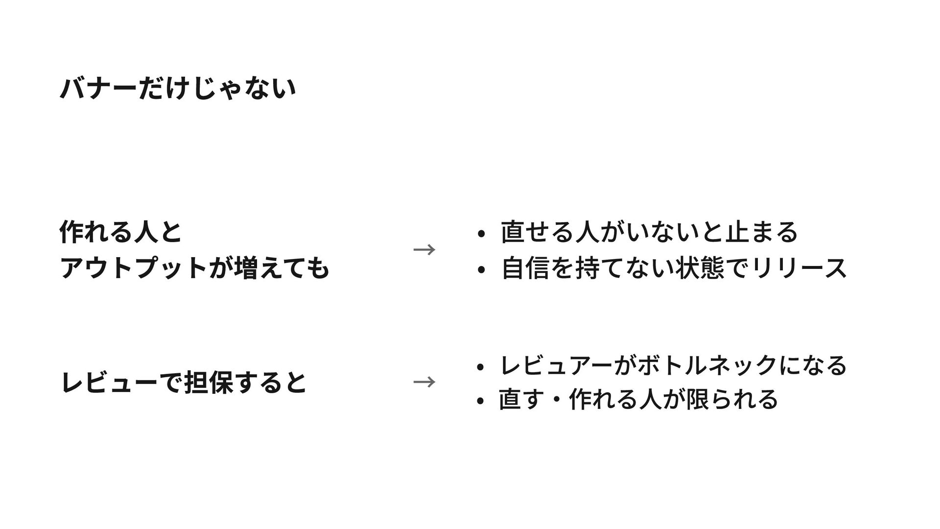 バナーだけじゃない 作れる人と アウトプットが増えても → 直せる人がいないと止まる 自信を持てない状態でリリース レビューで担保すると → レビュアーがボトルネックになる 直す・作れる人が限られる