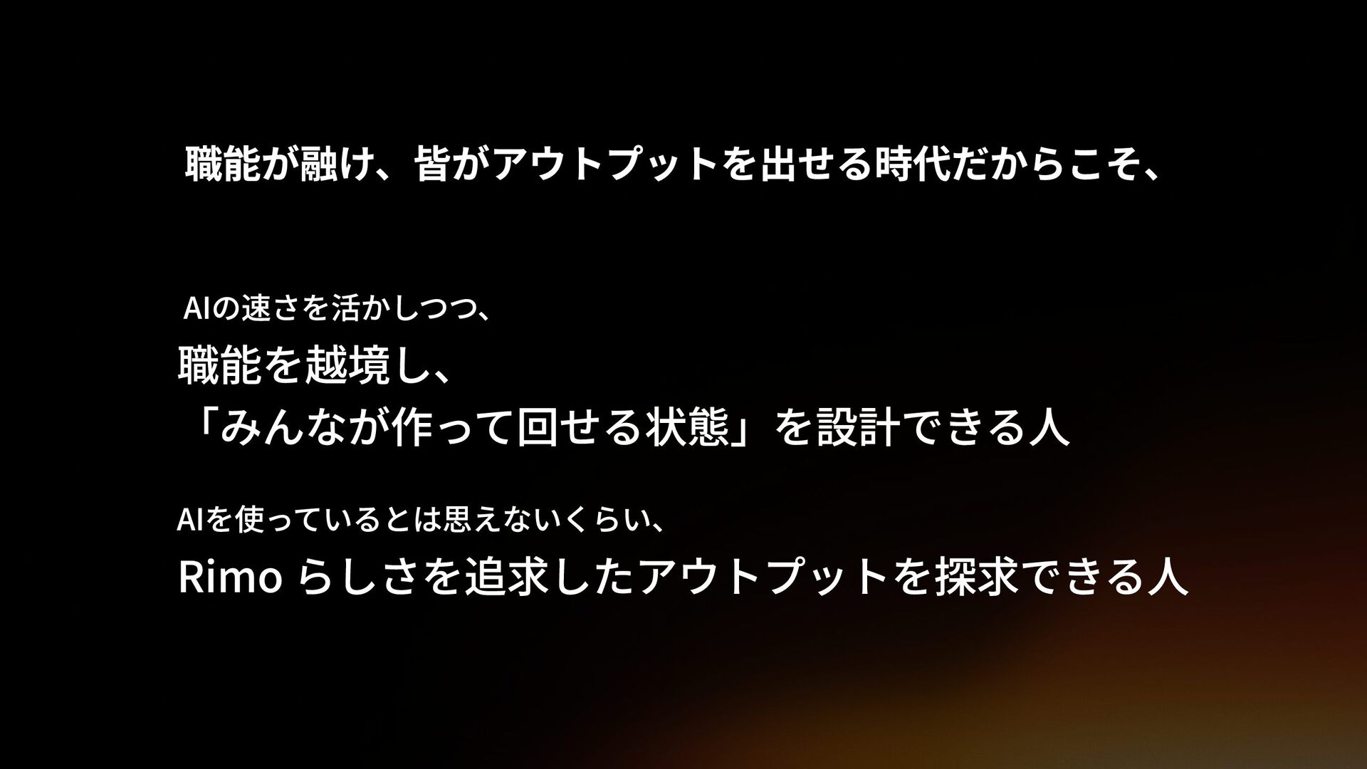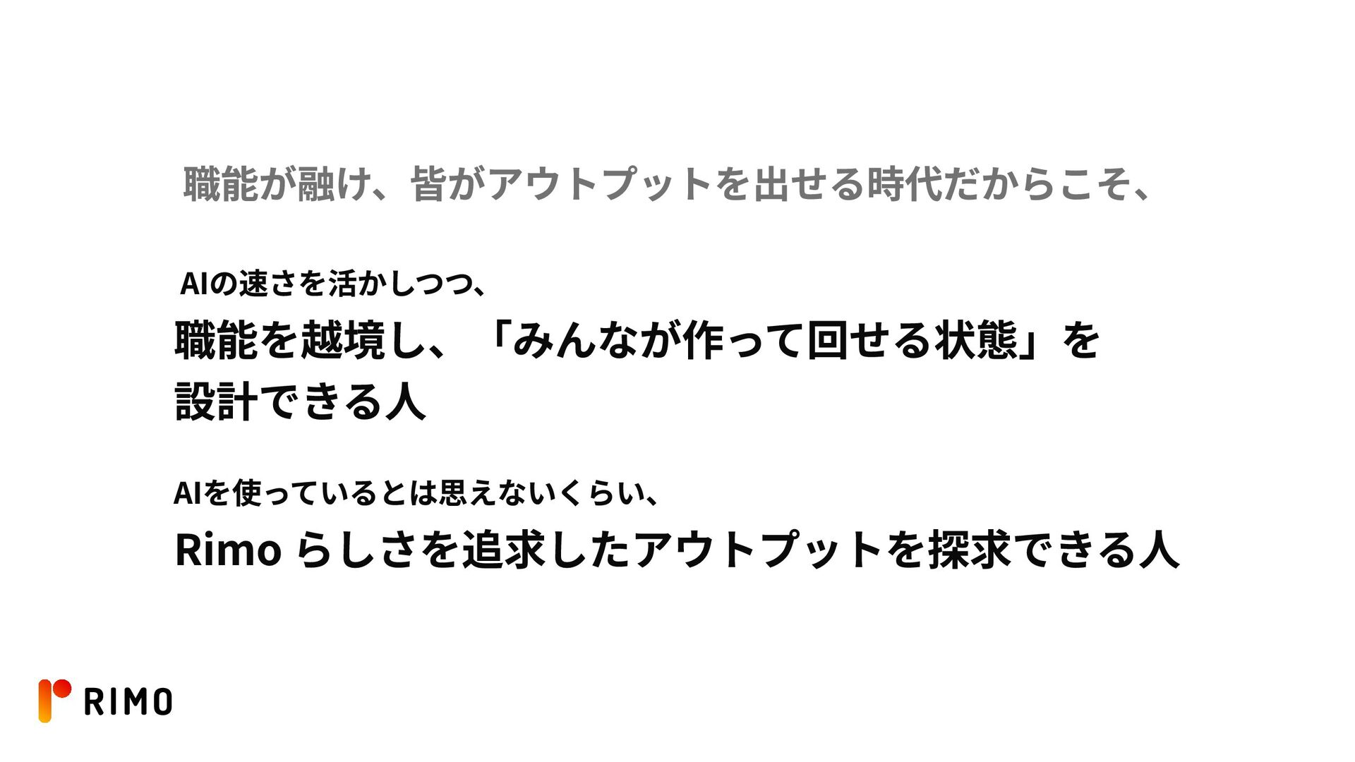 職能が融け、皆がアウトプットを出せる時代だからこそ、 AIの速さを活かしつつ、 職能を越境し、「みんなが作って回せる状態」を 設計できる人 AIを使っているとは思えないくらい、 Rimo らしさを追求したアウトプットを探求できる人