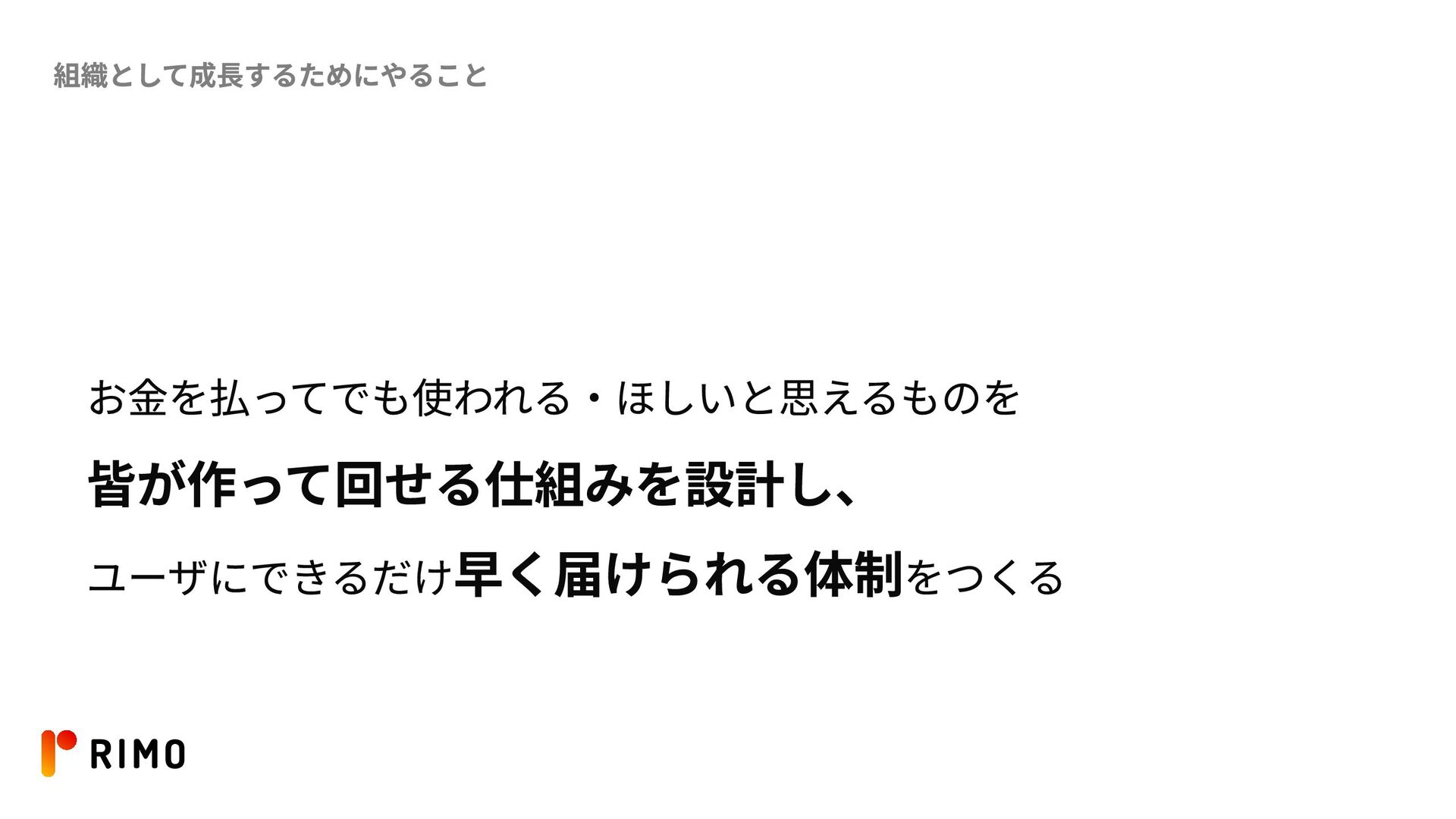 組織として成長するためにやること お金を払ってでも使われる・ほしいと思えるものを 皆が作って回せる仕組みを設計し、 ユーザにできるだけ早く届けられる体制をつくる