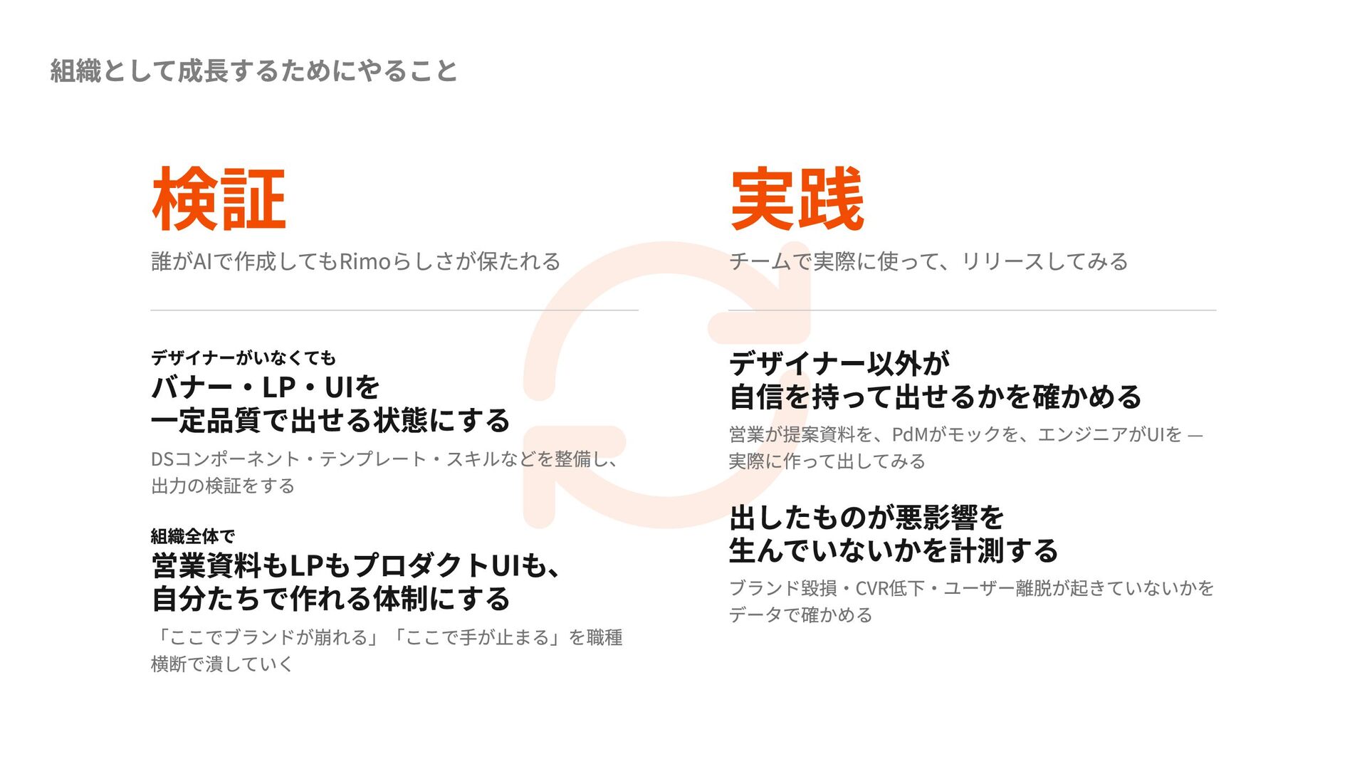 営業が提案資料を、PdMがモックを、エンジニアがUIを — 実際に作って出してみる 出したものが悪影響を 生んでいないかを計測する ブランド毀損・CVR低下・ユーザー離脱が起きていないかを データで確かめる DSコンポーネント・テンプレート・スキルなどを整備し、 出力の検証をする 組織全体で 営業資料もLPもプロダクトUIも、 自分たちで作れる体制にする 「ここでブランドが崩れる」「ここで手が止まる」を職種 横断で潰していく