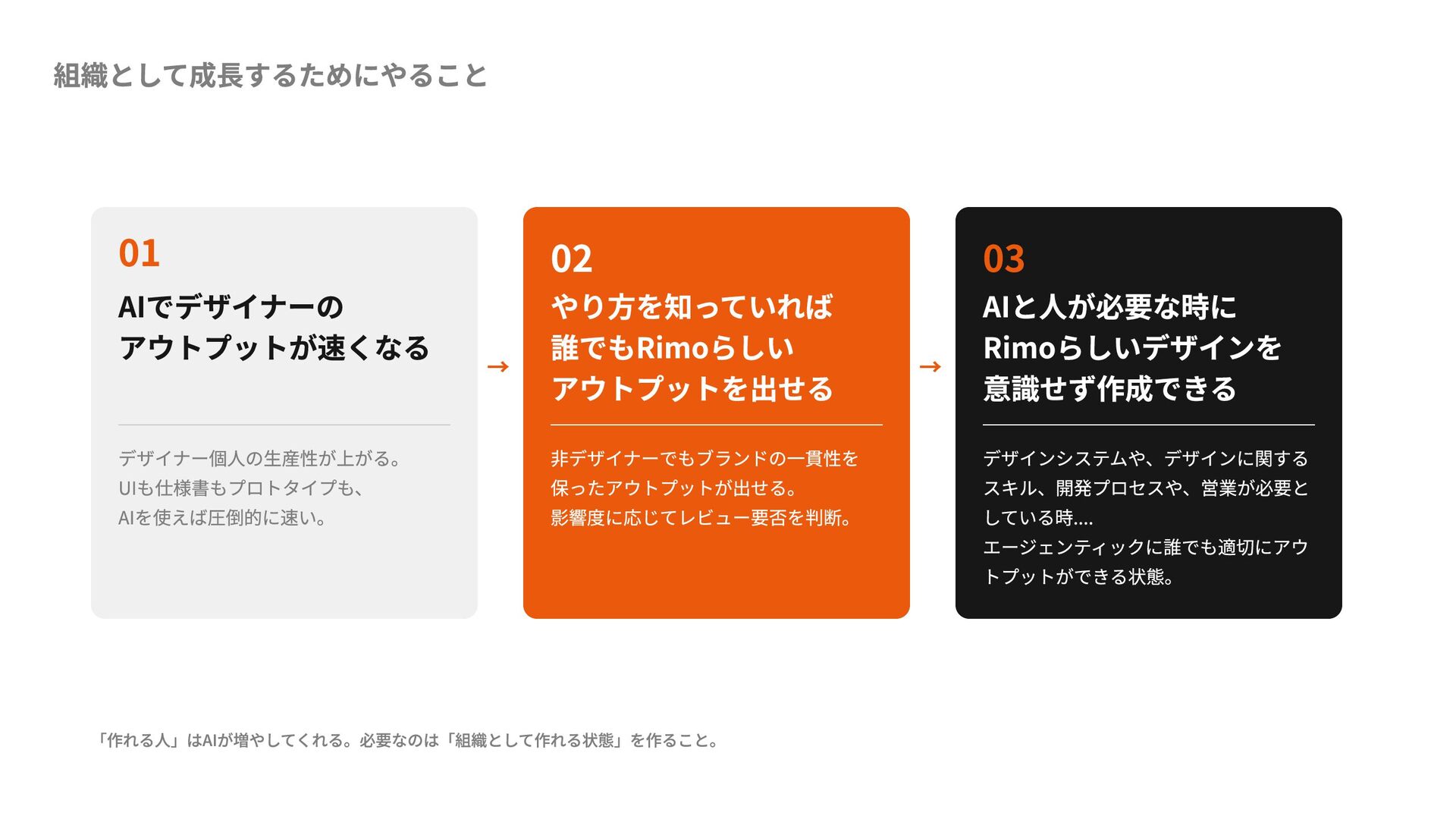 → 02 やり方を知っていれば 誰でもRimoらしい アウトプットを出せる 非デザイナーでもブランドの一貫性を 保ったアウトプットが出せる。 影響度に応じてレビュー要否を判断。 → 03 AIと人が必要な時に Rimoらしいデザインを 意識せず作成できる デザインシステムや、デザインに関する スキル、開発プロセスや、営業が必要と している時.... エージェンティックに誰でも適切にアウ トプットができる状態。 「作れる人」はAIが増やしてくれる。必要なのは「組織として作れる状態」を作ること。
