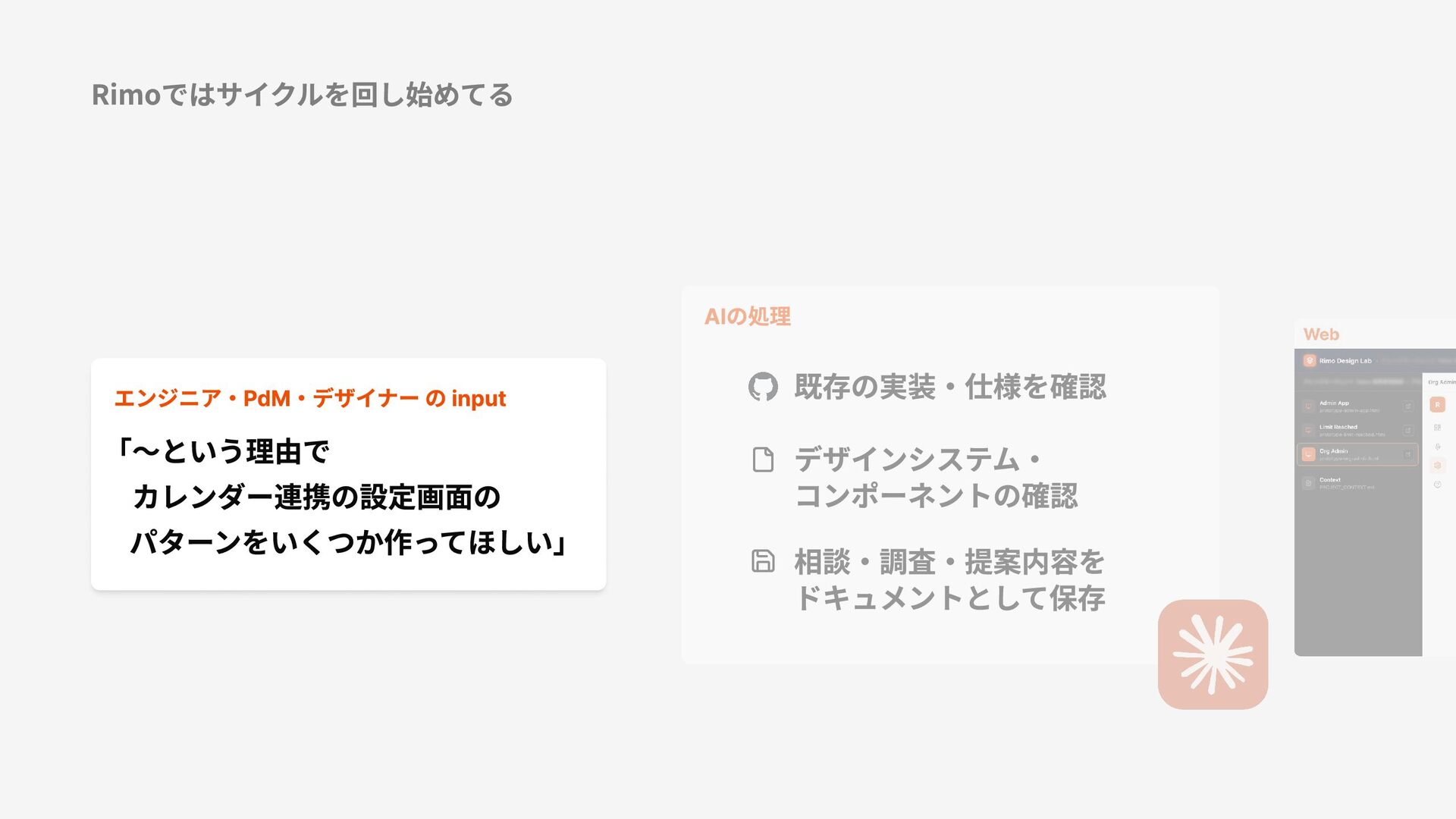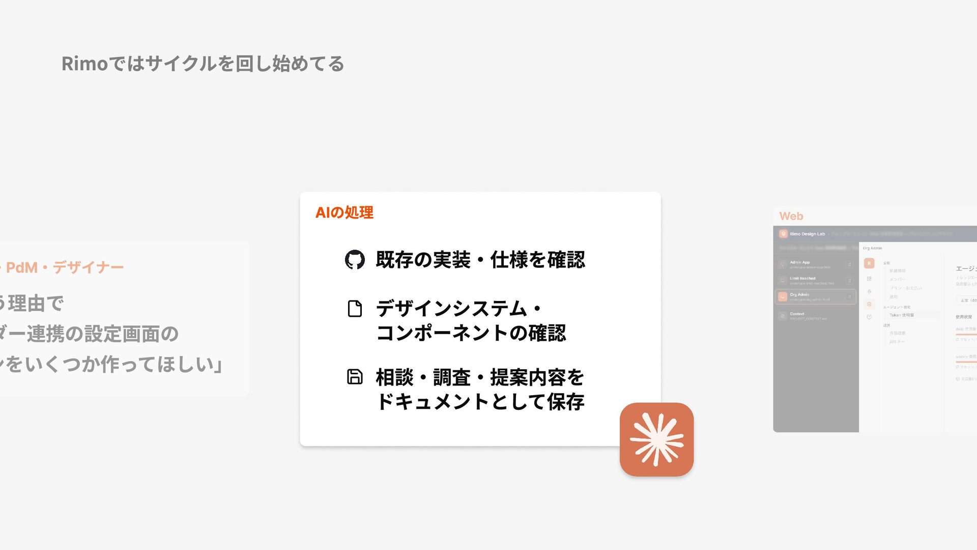 Rimoではサイクルを回し始めてる AIの処理 既存の実装・仕様を確認 デザインシステム・ コンポーネントの確認 相談・調査・提案内容を ドキュメントとして保存 ・PdM・デザイナー う理由で ダー連携の設定画面の