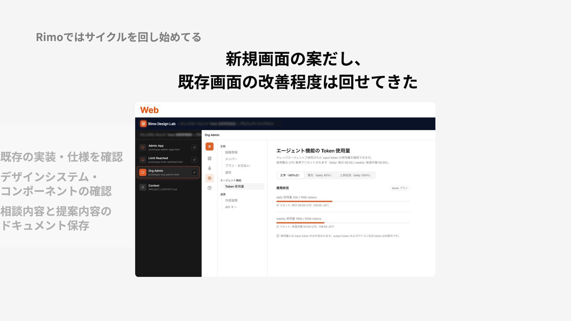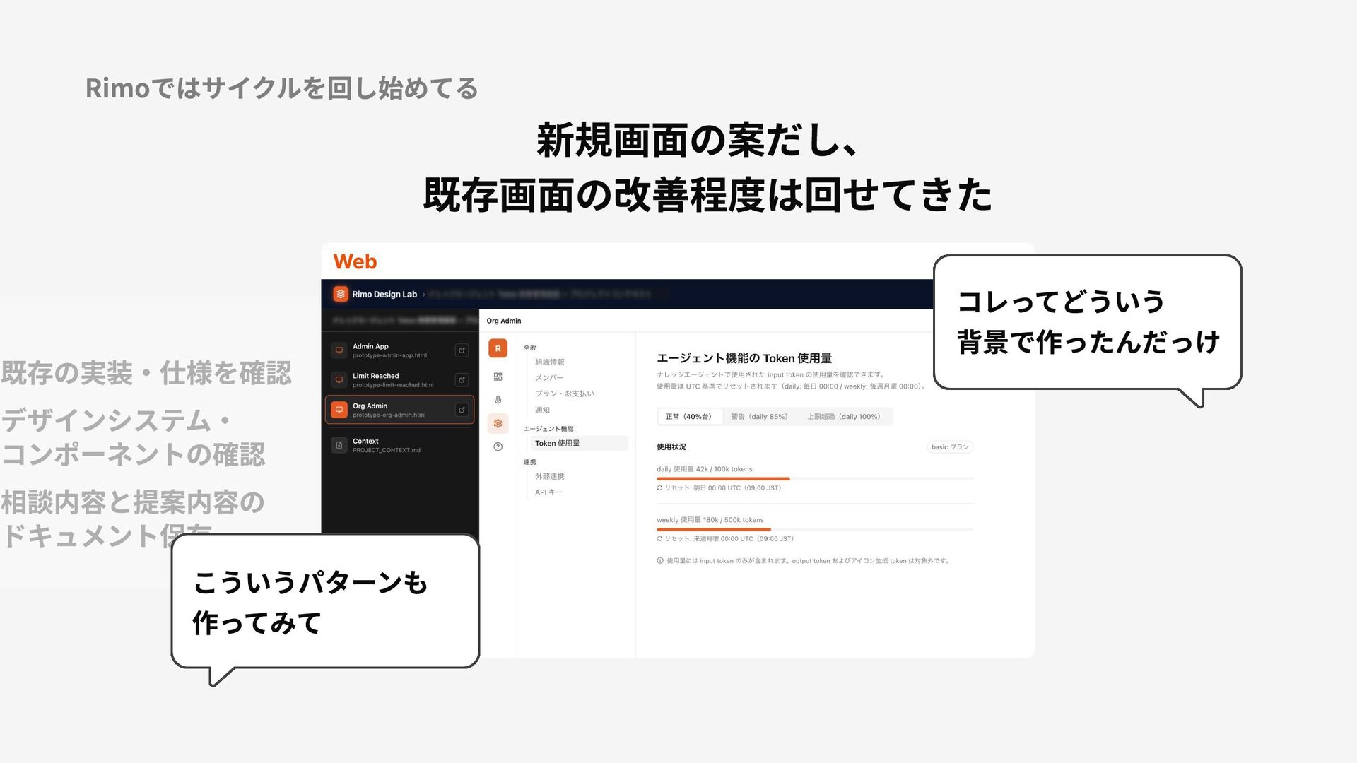 Rimoではサイクルを回し始めてる 新規画面の案だし、 既存画面の改善程度は回せてきた コレってどういう 背景で作ったんだっけ 既存の実装・仕様を確認 デザインシステム・ コンポーネントの確認 相談内容と提案内容の ドキュメント保存