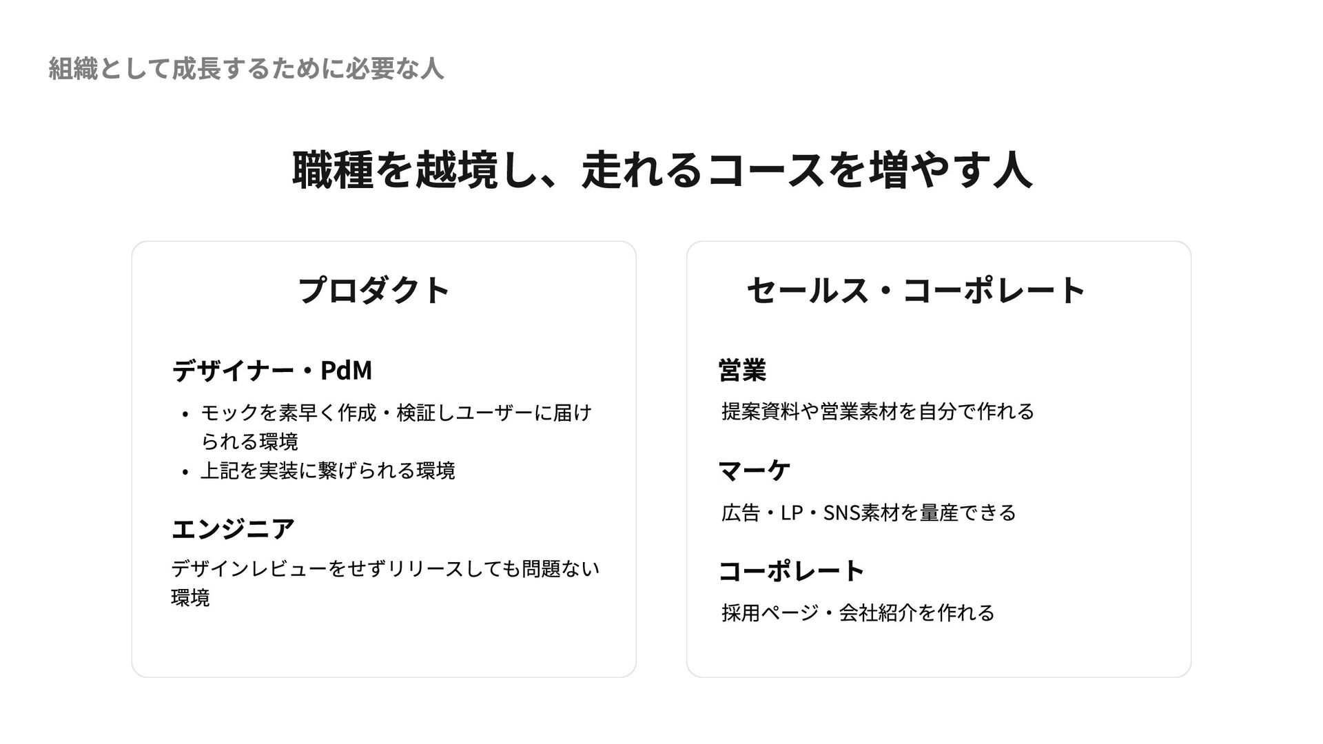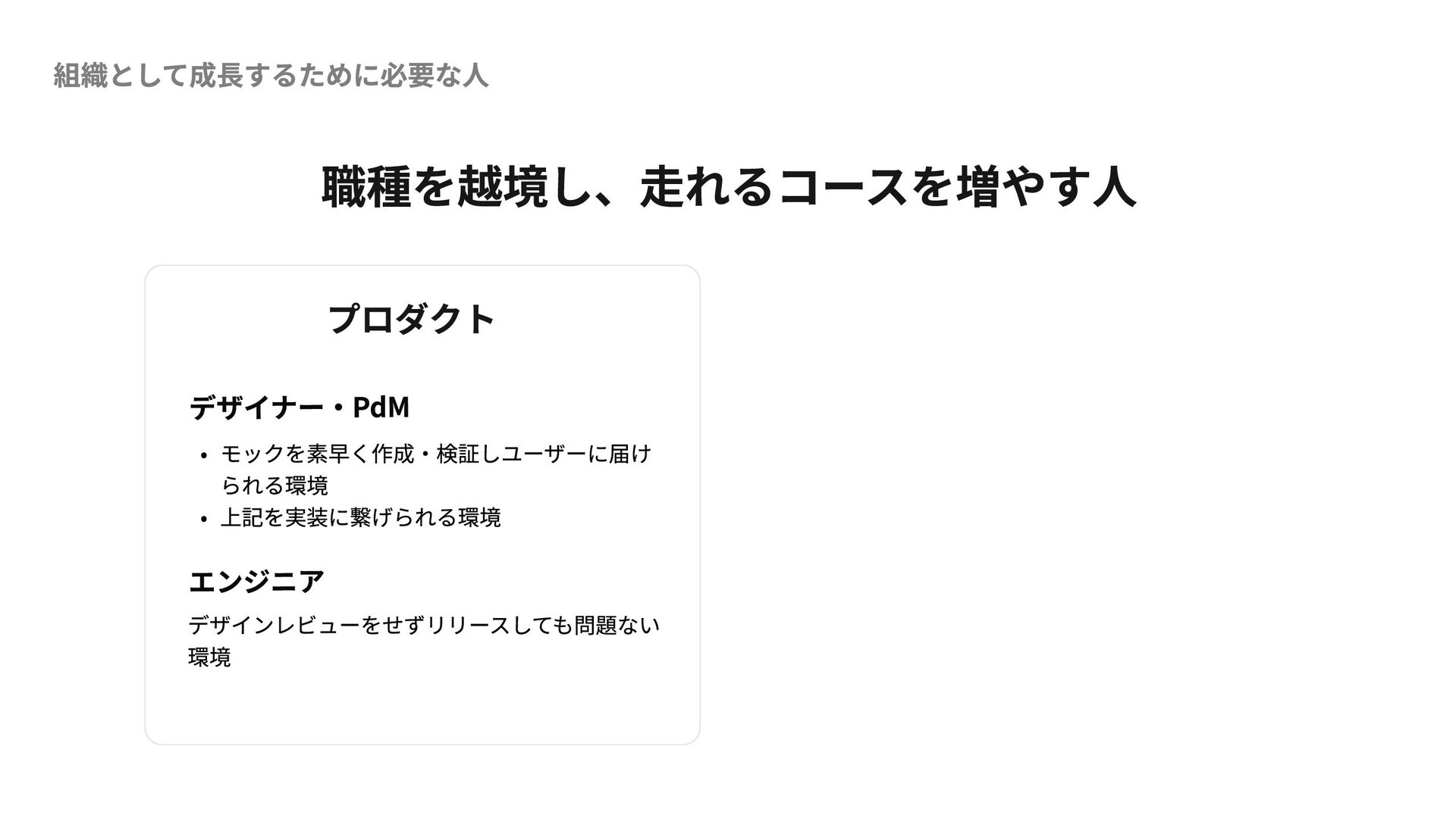 組織として成長するために必要な人 職種を越境し、走れるコースを増やす人 プロダクト デザイナー・PdM モックを素早く作成・検証しユーザーに届け られる環境 上記を実装に繋げられる環境 エンジニア デザインレビューをせずリリースしても問題ない 環境