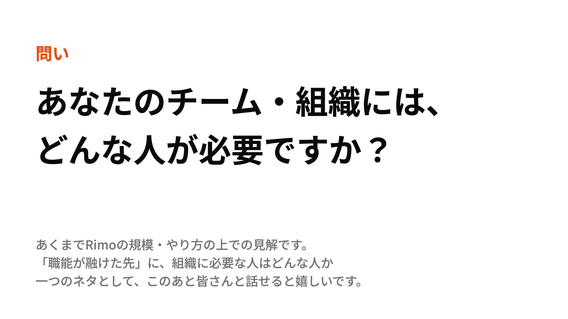 問い あなたのチーム・組織には、 どんな人が必要ですか? あくまでRimoの規模・やり方の上での見解です。 「職能が融けた先」に、組織に必要な人はどんな人か 一つのネタとして、このあと皆さんと話せると嬉しいです。