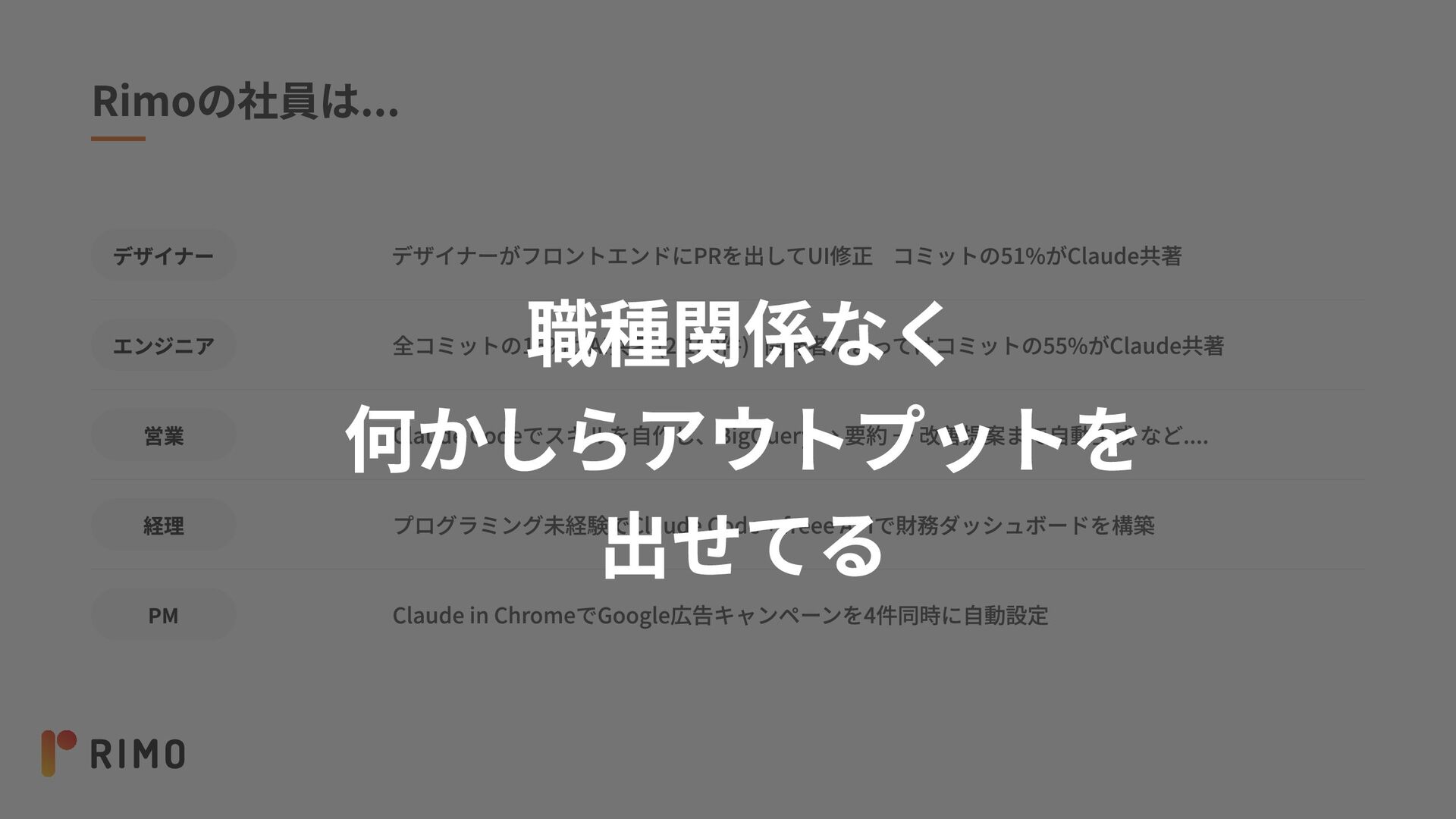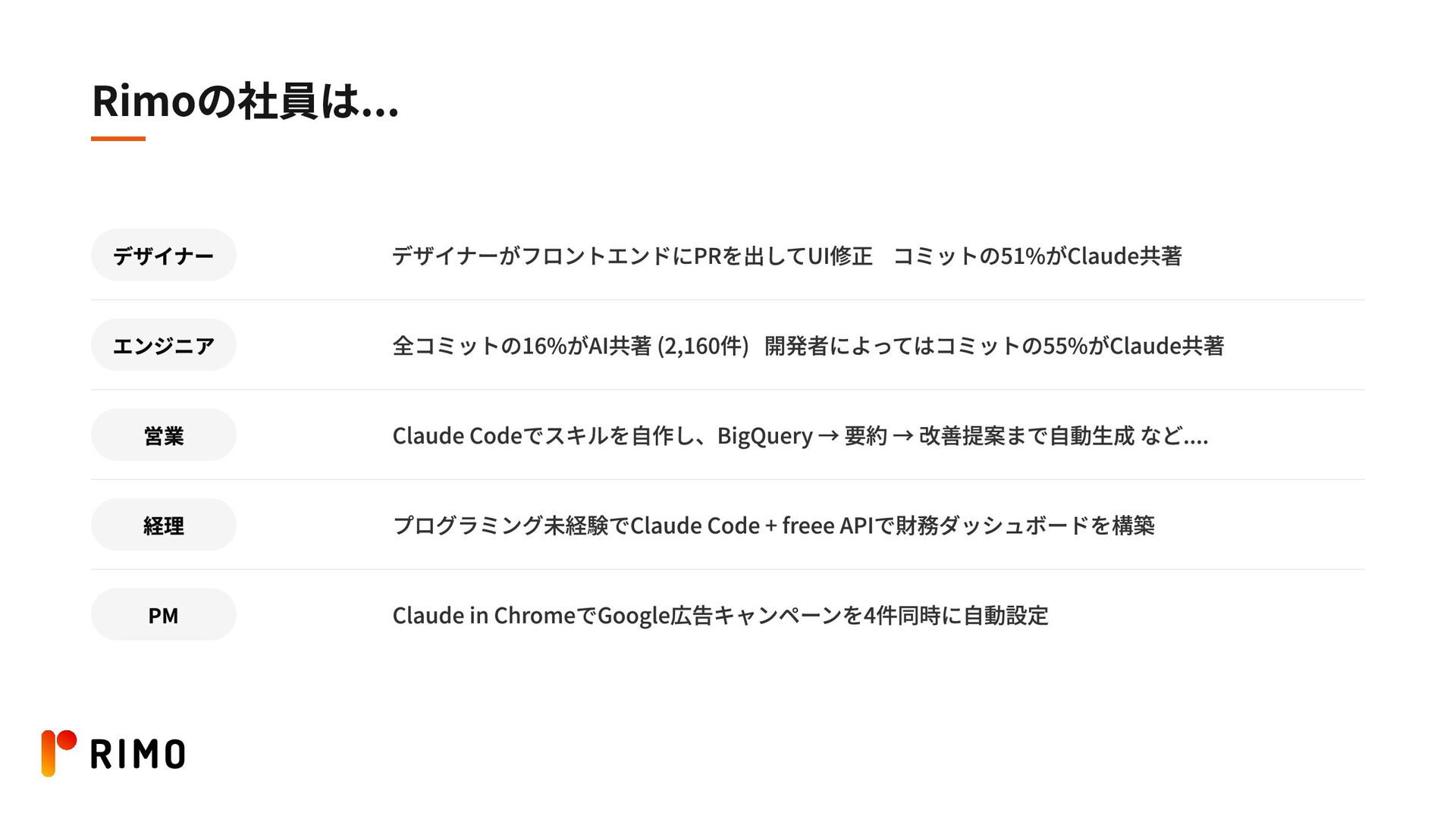 Rimoの社員は... デザイナーがフロントエンドにPRを出してUI修正 コミットの51%がClaude共著 デザイナー エンジニア 職種関係なく 何かしらアウトプットを 出せてる 全コミットの16%がAI共著 (2,160件)
