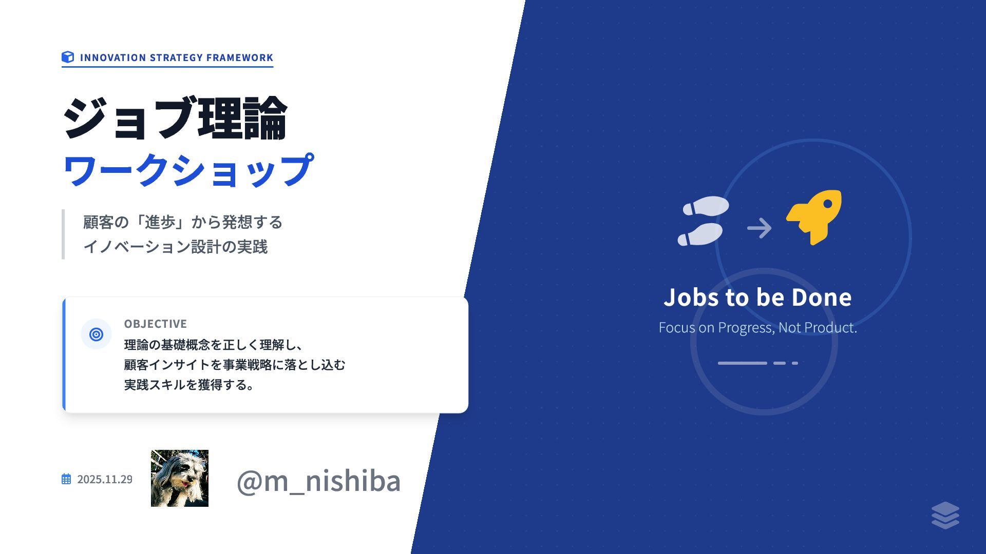 2025.11.29 @m_nishiba OBJECTIVE 理論の基礎概念を正しく理解し、 顧客インサイトを事業戦略に落とし込む 実践スキルを獲得する。 Jobs to be Done Focus on Progress, Not Product.