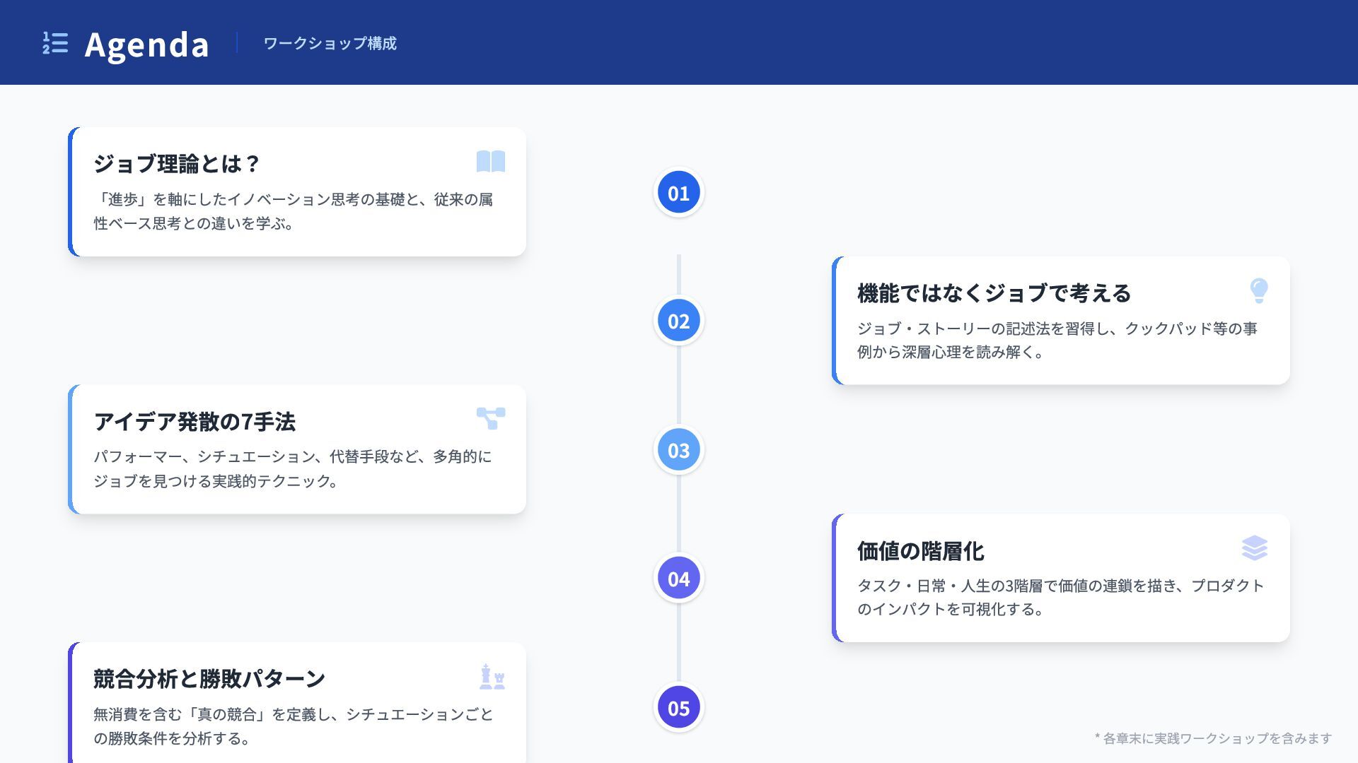 Agenda ワークショップ構成 * 各章末に実践ワークショップを含みます ジョブ理論とは? 「進歩」を軸にしたイノベーション思考の基礎と、従来の属 性ベース思考との違いを学ぶ。 01