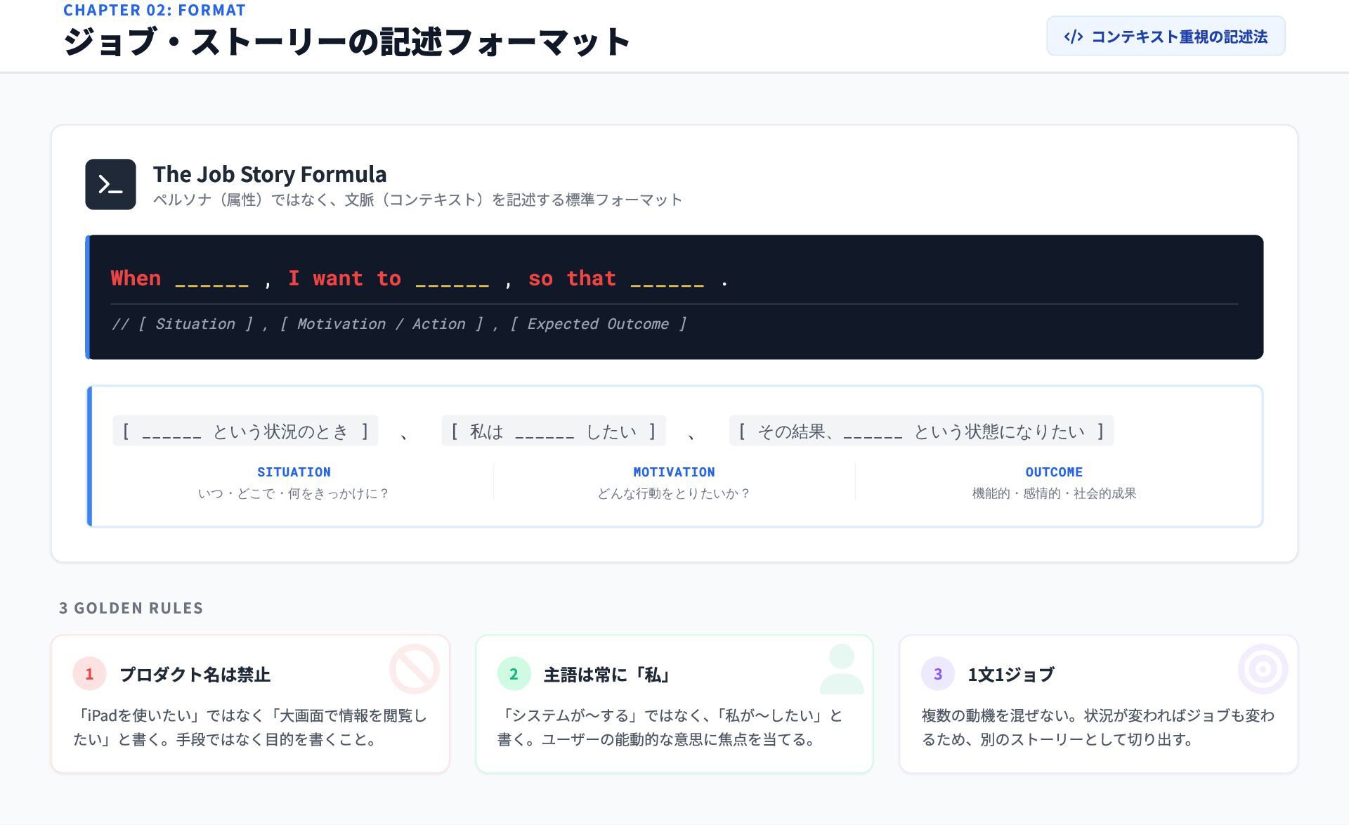 ______ , I want to ______ , so that ______ . // [ Situation ] , [ Motivation / Action ] , [ Expected Outcome ] [ ______ という状況のとき ] 、 [ 私は ______ したい ] 、 [ その結果、______ という状態になりたい ] SITUATION いつ・どこで・何をきっかけに? MOTIVATION どんな行動をとりたいか? OUTCOME 機能的・感情的・社会的成果 CHAPTER 02: FORMAT ジョブ・ストーリーの記述フォーマット コンテキスト重視の記述法 1 プロダクト名は禁止 「iPadを使いたい」ではなく「大画面で情報を閲覧し たい」と書く。手段ではなく目的を書くこと。 2 主語は常に「私」 「システムが〜する」ではなく、 「私が〜したい」と 書く。ユーザーの能動的な意思に焦点を当てる。 3 1文1ジョブ 複数の動機を混ぜない。状況が変わればジョブも変わ るため、別のストーリーとして切り出す。