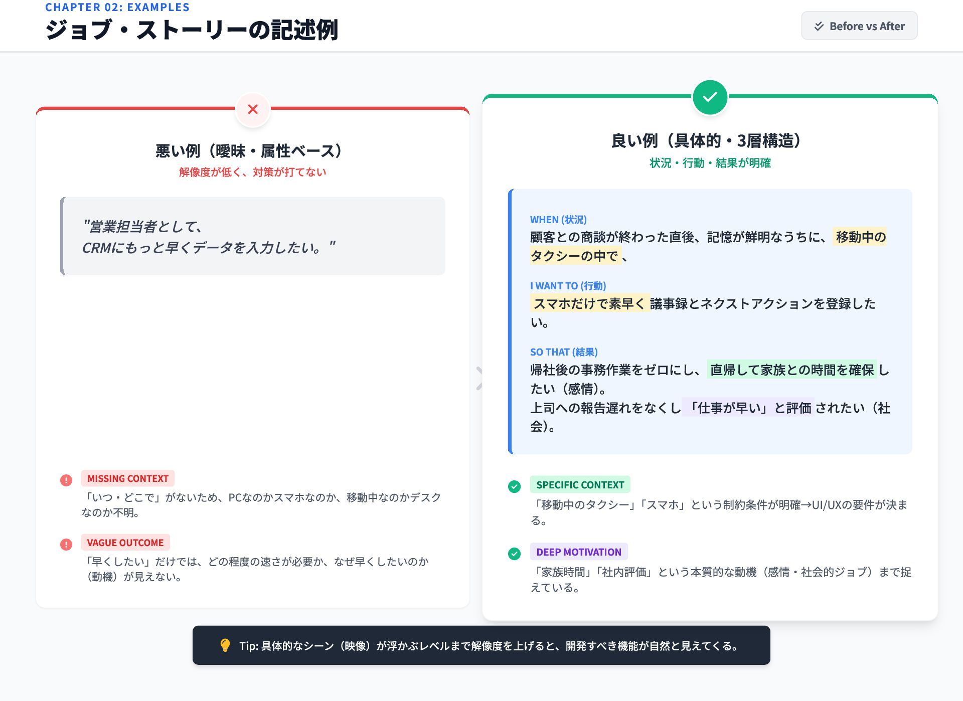 「いつ・どこで」がないため、PCなのかスマホなのか、移動中なのかデスク なのか不明。 VAGUE OUTCOME 「早くしたい」だけでは、どの程度の速さが必要か、なぜ早くしたいのか (動機)が見えない。 CHAPTER 02: EXAMPLES ジョブ・ストーリーの記述例 Before vs After 良い例(具体的・3層構造) 状況・行動・結果が明確 WHEN (状況) 顧客との商談が終わった直後、記憶が鮮明なうちに、移動中の タクシーの中で、 I WANT TO (行動) スマホだけで素早く議事録とネクストアクションを登録した い。 SO THAT (結果) 帰社後の事務作業をゼロにし、直帰して家族との時間を確保し たい(感情) 。 上司への報告遅れをなくし「仕事が早い」と評価されたい(社 会) 。 SPECIFIC CONTEXT 「移動中のタクシー」 「スマホ」という制約条件が明確→UI/UXの要件が決ま る。 DEEP MOTIVATION 「家族時間」 「社内評価」という本質的な動機(感情・社会的ジョブ)まで捉 えている。