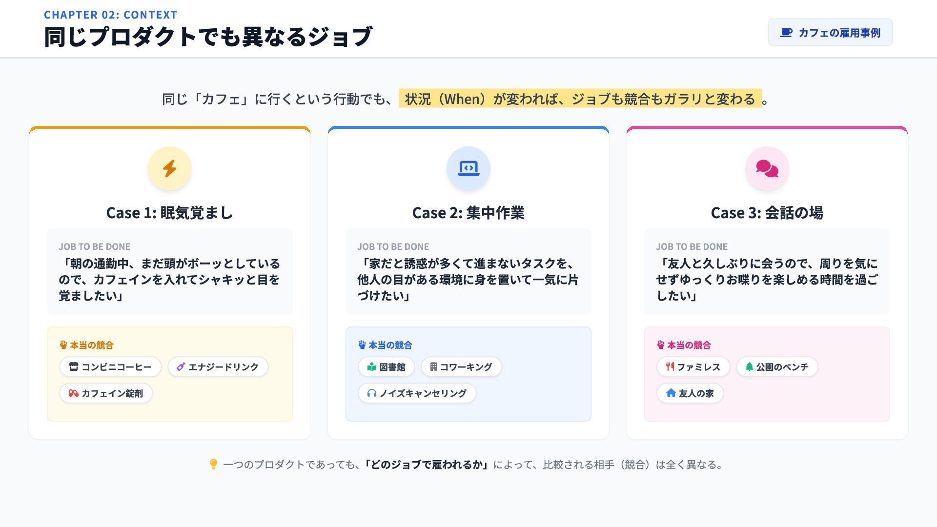 DONE 「朝の通勤中、まだ頭がボーッとしている ので、カフェインを入れてシャキッと目を 覚ましたい」 本当の競合 コンビニコーヒー エナジードリンク カフェイン錠剤 Case 2: 集中作業 JOB TO BE DONE 「家だと誘惑が多くて進まないタスクを、 他人の目がある環境に身を置いて一気に片 づけたい」 本当の競合 図書館 コワーキング ノイズキャンセリング Case 3: 会話の場 JOB TO BE DONE 「友人と久しぶりに会うので、周りを気に せずゆっくりお喋りを楽しめる時間を過ご したい」 本当の競合 ファミレス 公園のベンチ 友人の家 一つのプロダクトであっても、 「どのジョブで雇われるか」によって、比較される相手(競合)は全く異なる。 CHAPTER 02: CONTEXT 同じプロダクトでも異なるジョブ カフェの雇用事例