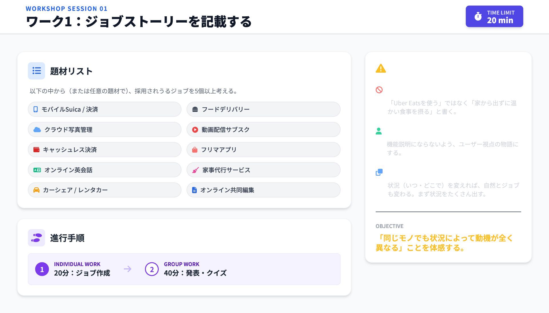 クラウド写真管理 動画配信サブスク キャッシュレス決済 フリマアプリ オンライン英会話 家事代行サービス カーシェア / レンタカー オンライン共同編集 進行手順 1 INDIVIDUAL WORK 20分:ジョブ作成 2 GROUP WORK 40分:発表・クイズ WORKSHOP SESSION 01 ワーク1:ジョブストーリーを記載する 20 min TIME LIMIT ワークのルール プロダクト名は書かない 「Uber Eatsを使う」ではなく「家から出ずに温 かい食事を摂る」と書く。 主語は「私」にする 機能説明にならないよう、ユーザー視点の物語に する。 Whenを先に量産する 状況(いつ・どこで)を変えれば、自然とジョブ も変わる。まず状況をたくさん出す。 OBJECTIVE 「同じモノでも状況によって動機が全く 異なる」ことを体感する。