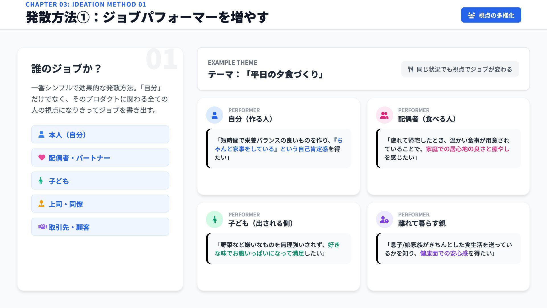 配偶者(食べる人) PERFORMER 子ども(出される側) PERFORMER 離れて暮らす親 01 「短時間で栄養バランスの良いものを作り、 『ち ゃんと家事をしている』という自己肯定感を得 たい」 「疲れて帰宅したとき、温かい食事が用意され ていることで、家庭での居心地の良さと癒やし を感じたい」 「野菜など嫌いなものを無理強いされず、好き な味でお腹いっぱいになって満足したい」 「息子/娘家族がきちんとした食生活を送ってい るかを知り、健康面での安心感を得たい」 CHAPTER 03: IDEATION METHOD 01 発散方法①:ジョブパフォーマーを増やす 視点の多様化 誰のジョブか? 一番シンプルで効果的な発散方法。 「自分」 だけでなく、そのプロダクトに関わる全ての 人の視点になりきってジョブを書き出す。 本人(自分) 配偶者・パートナー 子ども 上司・同僚 取引先・顧客