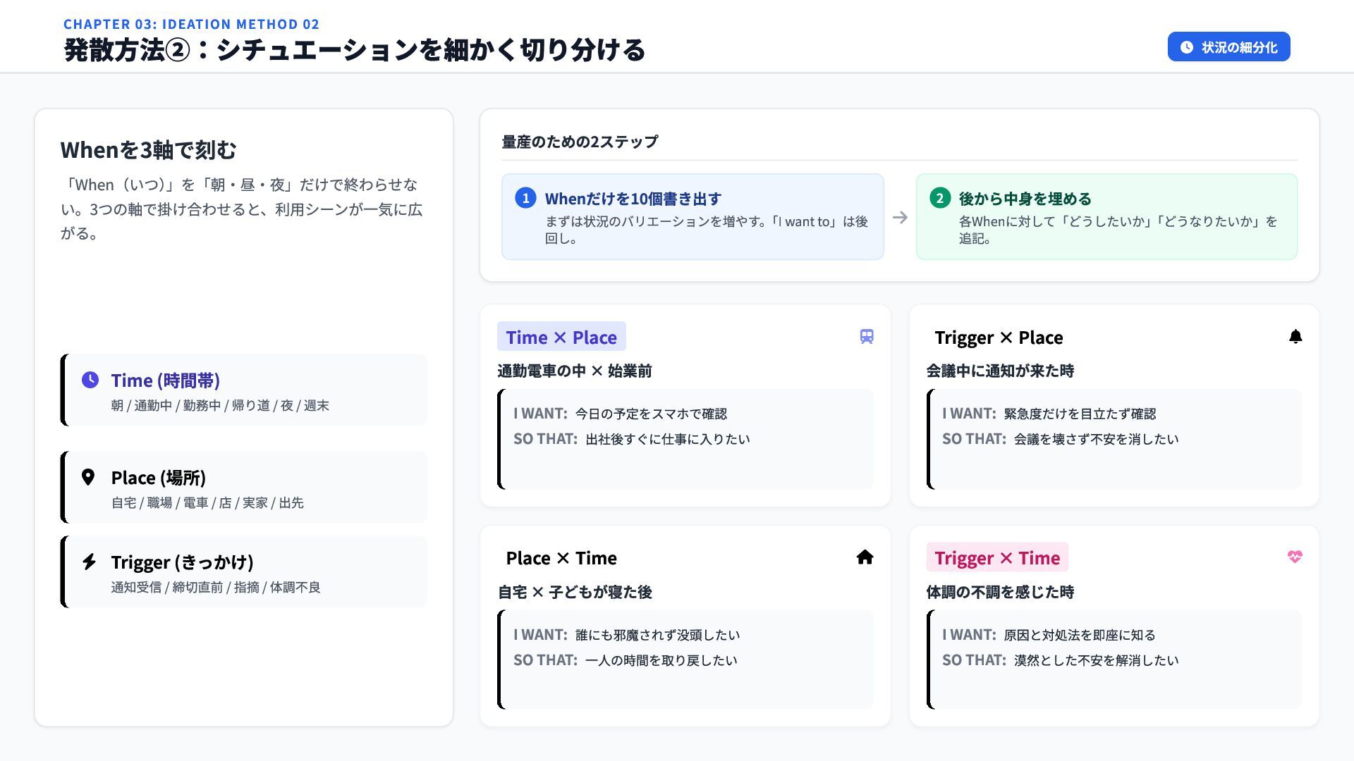 通勤中 / 勤務中 / 帰り道 / 夜 / 週末 Place (場所) 自宅 / 職場 / 電車 / 店 / 実家 / 出先 Trigger (きっかけ) 通知受信 / 締切直前 / 指摘 / 体調不良 量産のための2ステップ 1 Whenだけを10個書き出す まずは状況のバリエーションを増やす。 「I want to」は後 回し。 2 後から中身を埋める 各Whenに対して「どうしたいか」 「どうなりたいか」を 追記。 Time × Place 通勤電車の中 × 始業前 Trigger × Place 会議中に通知が来た時 Place × Time 自宅 × 子どもが寝た後 Trigger × Time 体調の不調を感じた時 I WANT: 今日の予定をスマホで確認 SO THAT: 出社後すぐに仕事に入りたい I WANT: 緊急度だけを目立たず確認 SO THAT: 会議を壊さず不安を消したい I WANT: 誰にも邪魔されず没頭したい SO THAT: 一人の時間を取り戻したい I WANT: 原因と対処法を即座に知る SO THAT: 漠然とした不安を解消したい CHAPTER 03: IDEATION METHOD 02 発散方法②:シチュエーションを細かく切り分ける 状況の細分化