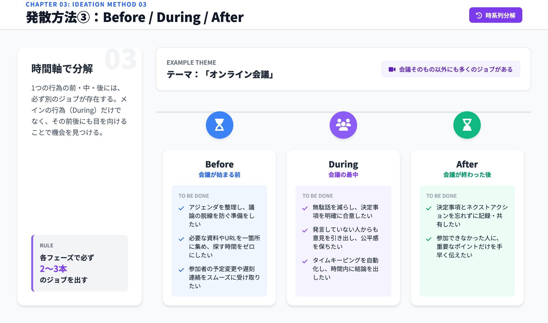 DONE During 会議の最中 TO BE DONE After 会議が終わった後 TO BE DONE アジェンダを整理し、議 論の脱線を防ぐ準備をし たい 必要な資料やURLを一箇所 に集め、探す時間をゼロ にしたい 参加者の予定変更や遅刻 連絡をスムーズに受け取り たい 無駄話を減らし、決定事 項を明確に合意したい 発言していない人からも 意見を引き出し、公平感 を保ちたい タイムキーピングを自動 化し、時間内に結論を出 したい 決定事項とネクストアクシ ョンを忘れずに記録・共 有したい 参加できなかった人に、 重要なポイントだけを手 早く伝えたい CHAPTER 03: IDEATION METHOD 03 発散方法③:Before / During / After 時系列分解 時間軸で分解 1つの行為の前・中・後には、 必ず別のジョブが存在する。メ インの行為(During)だけで なく、その前後にも目を向ける ことで機会を見つける。 RULE 各フェーズで必ず 2〜3本 のジョブを出す