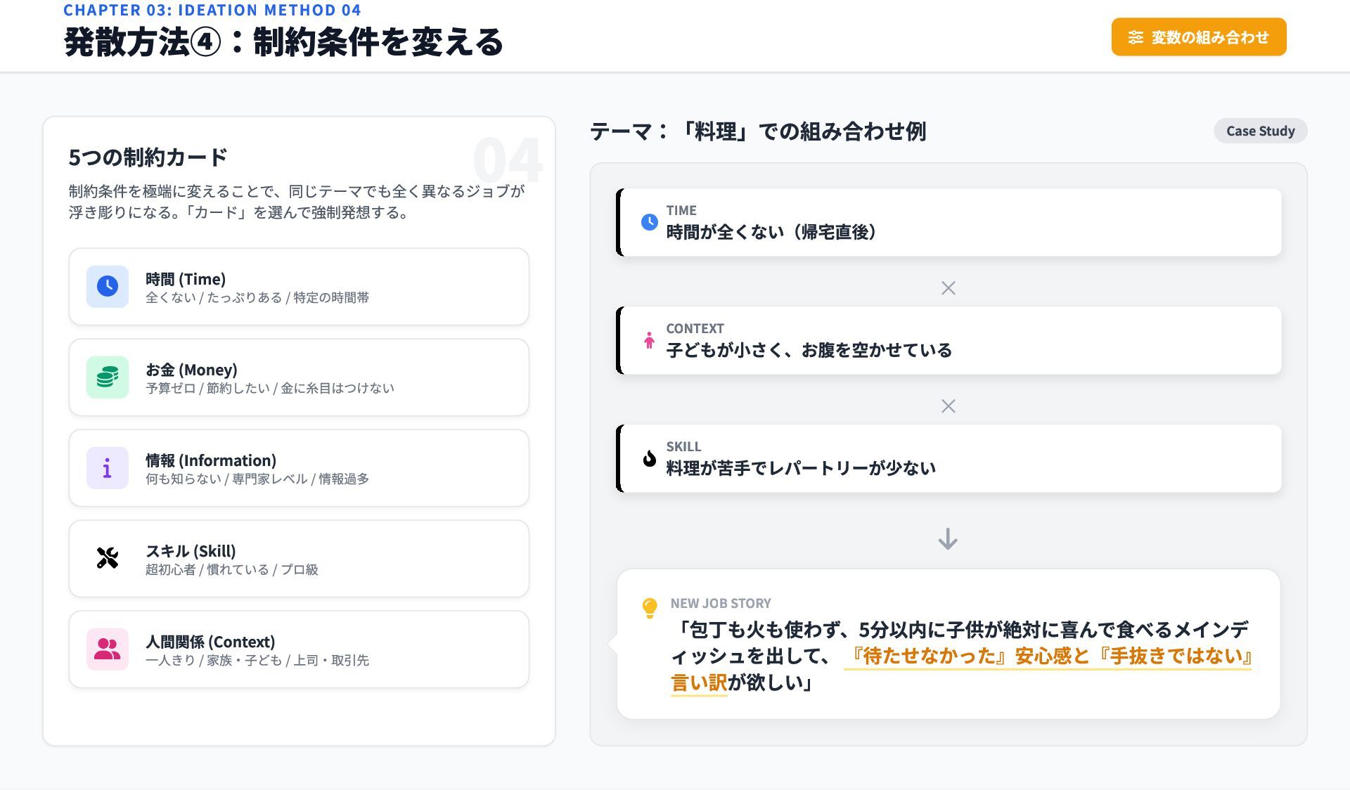 SKILL 料理が苦手でレパートリーが少ない 04 × × NEW JOB STORY 「包丁も火も使わず、5分以内に子供が絶対に喜んで食べるメインデ ィッシュを出して、 『待たせなかった』安心感と『手抜きではない』 言い訳が欲しい」 CHAPTER 03: IDEATION METHOD 04 発散方法④:制約条件を変える 変数の組み合わせ 5つの制約カード 制約条件を極端に変えることで、同じテーマでも全く異なるジョブが 浮き彫りになる。 「カード」を選んで強制発想する。 時間 (Time) 全くない / たっぷりある / 特定の時間帯 お金 (Money) 予算ゼロ / 節約したい / 金に糸目はつけない 情報 (Information) 何も知らない / 専門家レベル / 情報過多 スキル (Skill) 超初心者 / 慣れている / プロ級 人間関係 (Context) 一人きり / 家族・子ども / 上司・取引先