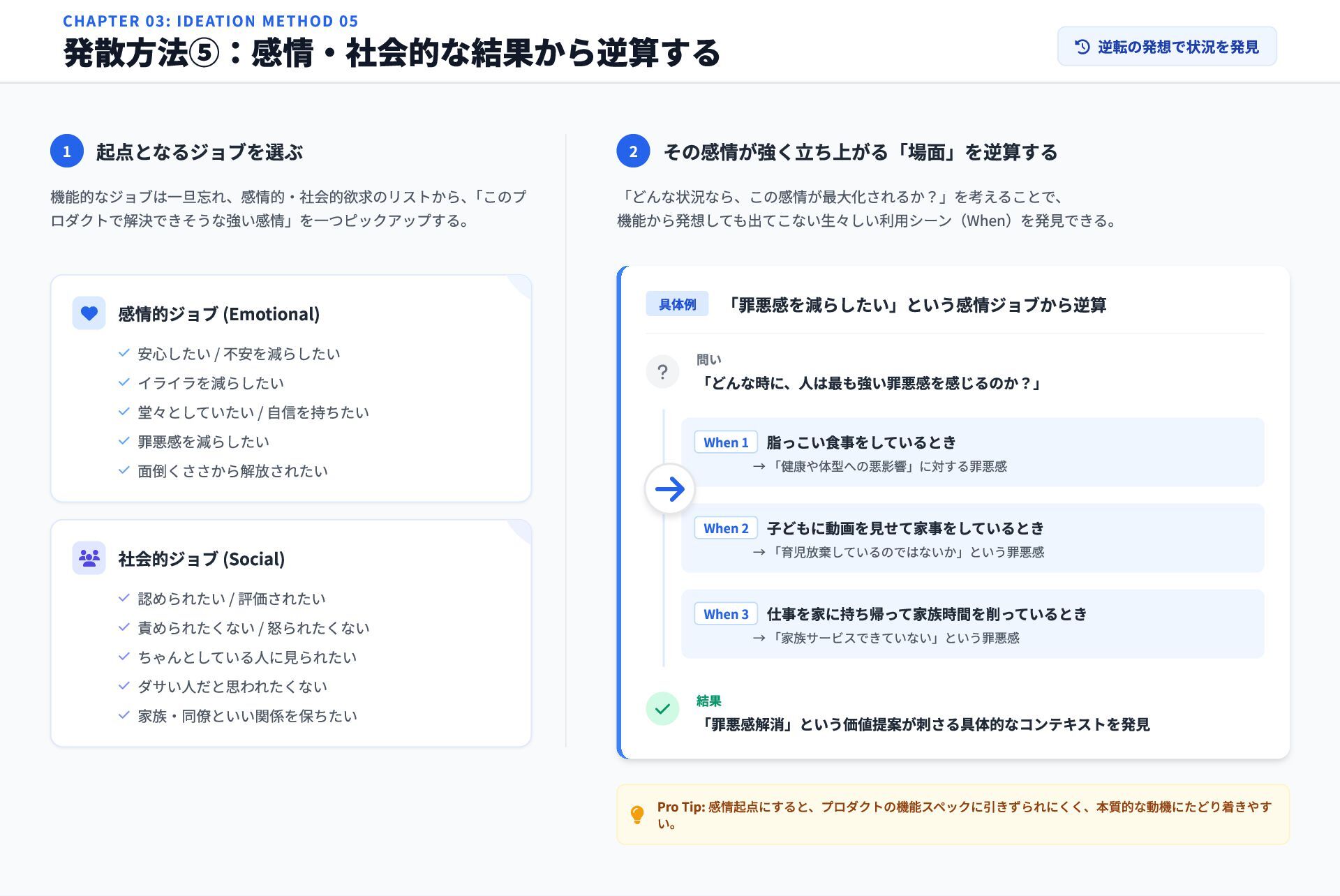 「罪悪感を減らしたい」という感情ジョブから逆算 ? 問い 「どんな時に、人は最も強い罪悪感を感じるのか?」 When 1 脂っこい食事をしているとき → 「健康や体型への悪影響」に対する罪悪感 When 2 子どもに動画を見せて家事をしているとき → 「育児放棄しているのではないか」という罪悪感 When 3 仕事を家に持ち帰って家族時間を削っているとき → 「家族サービスできていない」という罪悪感 結果 「罪悪感解消」という価値提案が刺さる具体的なコンテキストを発見 Pro Tip: 感情起点にすると、プロダクトの機能スペックに引きずられにくく、本質的な動機にたどり着きやす い。 CHAPTER 03: IDEATION METHOD 05 発散方法⑤:感情・社会的な結果から逆算する 逆転の発想で状況を発見 感情的ジョブ (Emotional) 安心したい / 不安を減らしたい イライラを減らしたい 堂々としていたい / 自信を持ちたい 罪悪感を減らしたい 面倒くささから解放されたい 社会的ジョブ (Social) 認められたい / 評価されたい 責められたくない / 怒られたくない ちゃんとしている人に見られたい ダサい人だと思われたくない 家族・同僚といい関係を保ちたい