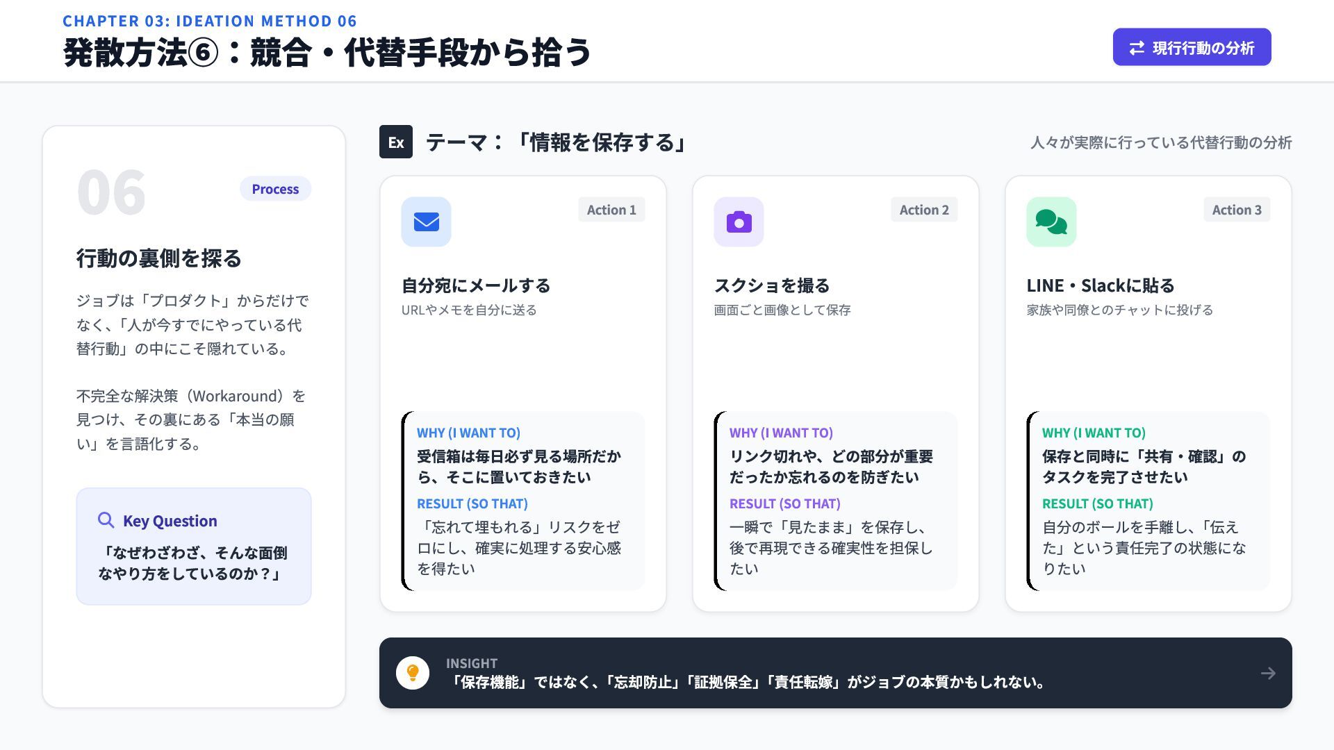 06 Process Action 1 自分宛にメールする URLやメモを自分に送る WHY (I WANT TO) 受信箱は毎日必ず見る場所だか ら、そこに置いておきたい RESULT (SO THAT) 「忘れて埋もれる」リスクをゼ ロにし、確実に処理する安心感 を得たい Action 2 スクショを撮る 画面ごと画像として保存 WHY (I WANT TO) リンク切れや、どの部分が重要 だったか忘れるのを防ぎたい RESULT (SO THAT) 一瞬で「見たまま」を保存し、 後で再現できる確実性を担保し たい Action 3 LINE・Slackに貼る 家族や同僚とのチャットに投げる WHY (I WANT TO) 保存と同時に「共有・確認」の タスクを完了させたい RESULT (SO THAT) 自分のボールを手離し、 「伝え た」という責任完了の状態にな りたい CHAPTER 03: IDEATION METHOD 06 発散方法⑥:競合・代替手段から拾う 現行行動の分析 行動の裏側を探る ジョブは「プロダクト」からだけで なく、 「人が今すでにやっている代 替行動」の中にこそ隠れている。 不完全な解決策(Workaround)を 見つけ、その裏にある「本当の願 い」を言語化する。 Key Question 「なぜわざわざ、そんな面倒 なやり方をしているのか?」
