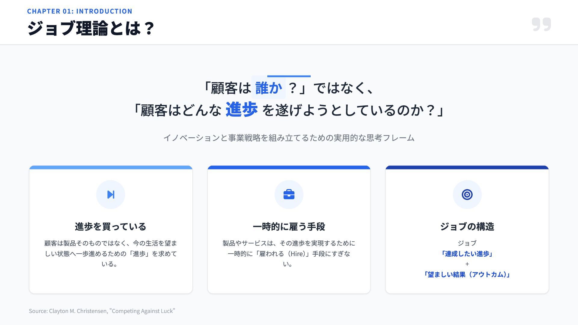 顧客は製品そのものではなく、今の生活を望ま しい状態へ一歩進めるための「進歩」を求めて いる。 一時的に雇う手段 製品やサービスは、その進歩を実現するために 一時的に「雇われる(Hire) 」手段にすぎな い。 ジョブの構造 ジョブ 「達成したい進歩」 + 「望ましい結果(アウトカム) 」 Source: Clayton M. Christensen, "Competing Against Luck"