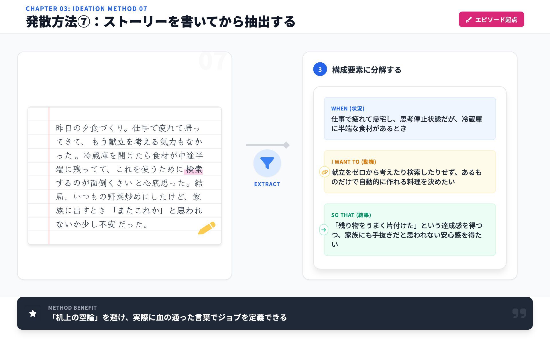 いきなり型に当てはめず、日記のように「あったこと」を書く。その 後、感情が動いた瞬間にマーカーを引く。 Step 2: 「願望」や「不安」にマーカーを引く 07 WHEN (状況) 仕事で疲れて帰宅し、思考停止状態だが、冷蔵庫 に半端な食材があるとき I WANT TO (動機) 献立をゼロから考えたり検索したりせず、あるも のだけで自動的に作れる料理を決めたい SO THAT (結果) 「残り物をうまく片付けた」という達成感を得つ つ、家族にも手抜きだと思われない安心感を得た い CHAPTER 03: IDEATION METHOD 07 発散方法⑦:ストーリーを書いてから抽出する エピソード起点 昨日の夕食づくり。仕事で疲れて帰っ てきて、 もう献立を考える気力もなか った 。冷蔵庫を開けたら食材が中途半 端に残ってて、これを使うために 検索 するのが面倒くさい と心底思った。結 局、いつもの野菜炒めにしたけど、家 族に出すとき 「またこれか」と思われ ないか少し不安 だった。