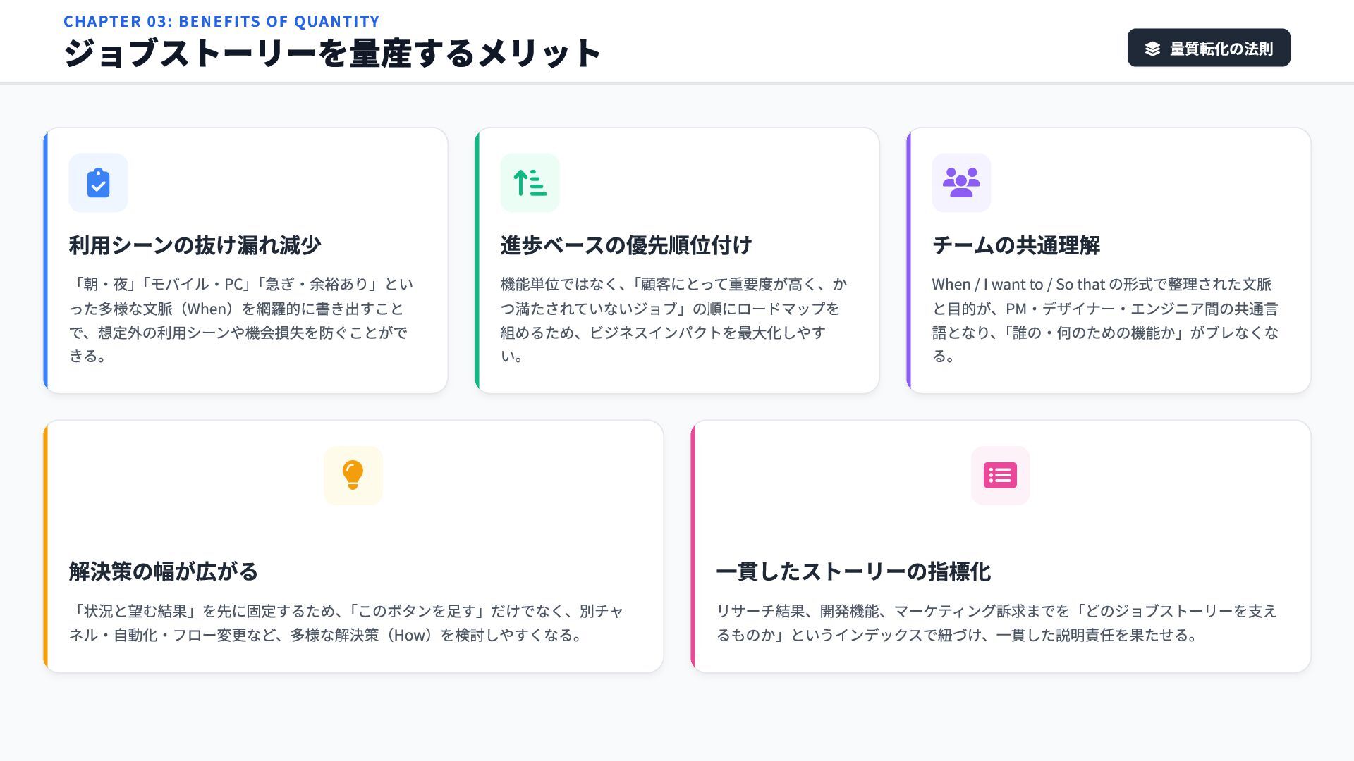 機能単位ではなく、 「顧客にとって重要度が高く、か つ満たされていないジョブ」の順にロードマップを 組めるため、ビジネスインパクトを最大化しやす い。 チームの共通理解 When / I want to / So that の形式で整理された文脈 と目的が、PM・デザイナー・エンジニア間の共通言 語となり、 「誰の・何のための機能か」がブレなくな る。 解決策の幅が広がる 「状況と望む結果」を先に固定するため、 「このボタンを足す」だけでなく、別チャ ネル・自動化・フロー変更など、多様な解決策(How)を検討しやすくなる。 一貫したストーリーの指標化 リサーチ結果、開発機能、マーケティング訴求までを「どのジョブストーリーを支え るものか」というインデックスで紐づけ、一貫した説明責任を果たせる。 CHAPTER 03: BENEFITS OF QUANTITY ジョブストーリーを量産するメリット 量質転化の法則