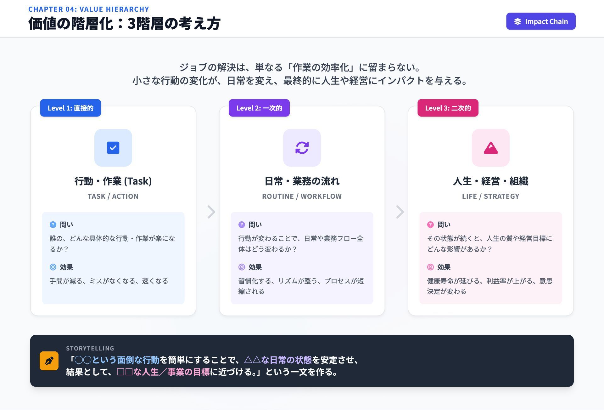 CHAPTER 04: VALUE HIERARCHY 価値の階層化:3階層の考え方 Impact Chain ジョブの解決は、単なる「作業の効率化」に留まらない。 小さな行動の変化が、日常を変え、最終的に人生や経営にインパクトを与える。