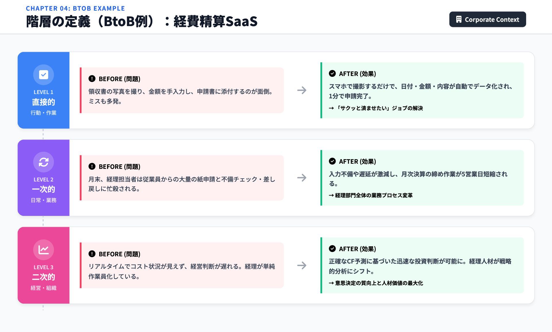 CHAPTER 04: BTOB EXAMPLE 階層の定義(BtoB例):経費精算SaaS Corporate Context 直接的