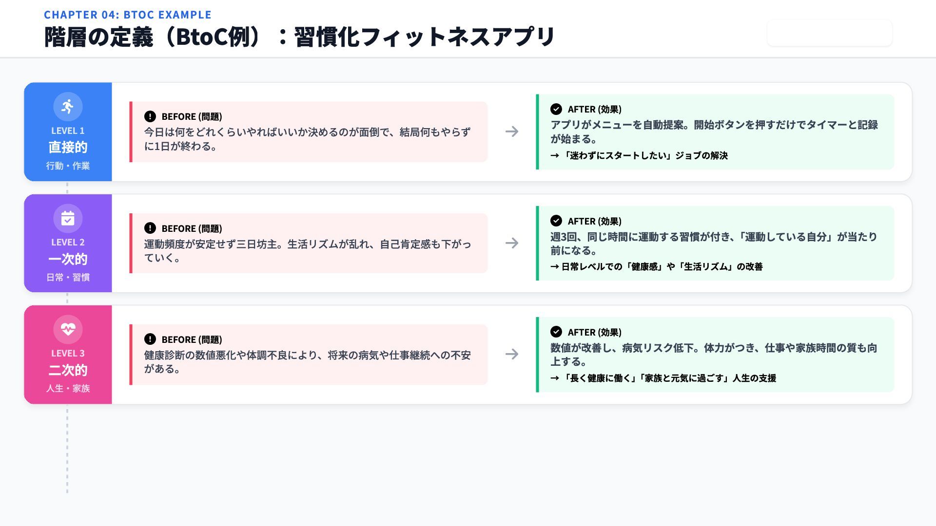 BEFORE (問題) 今日は何をどれくらいやればいいか決めるのが面倒で、結局何もやらず に1日が終わる。 AFTER (効果) アプリがメニューを自動提案。開始ボタンを押すだけでタイマーと記録 が始まる。 → 「迷わずにスタートしたい」ジョブの解決 LEVEL 1 行動・作業 一次的 BEFORE (問題) 運動頻度が安定せず三日坊主。生活リズムが乱れ、自己肯定感も下がっ ていく。 AFTER (効果) 週3回、同じ時間に運動する習慣が付き、 「運動している自分」が当たり 前になる。 → 日常レベルでの「健康感」や「生活リズム」の改善 LEVEL 2 日常・習慣 二次的 BEFORE (問題) 健康診断の数値悪化や体調不良により、将来の病気や仕事継続への不安 がある。 AFTER (効果) 数値が改善し、病気リスク低下。体力がつき、仕事や家族時間の質も向 上する。 → 「長く健康に働く」 「家族と元気に過ごす」人生の支援 LEVEL 3 人生・家族
