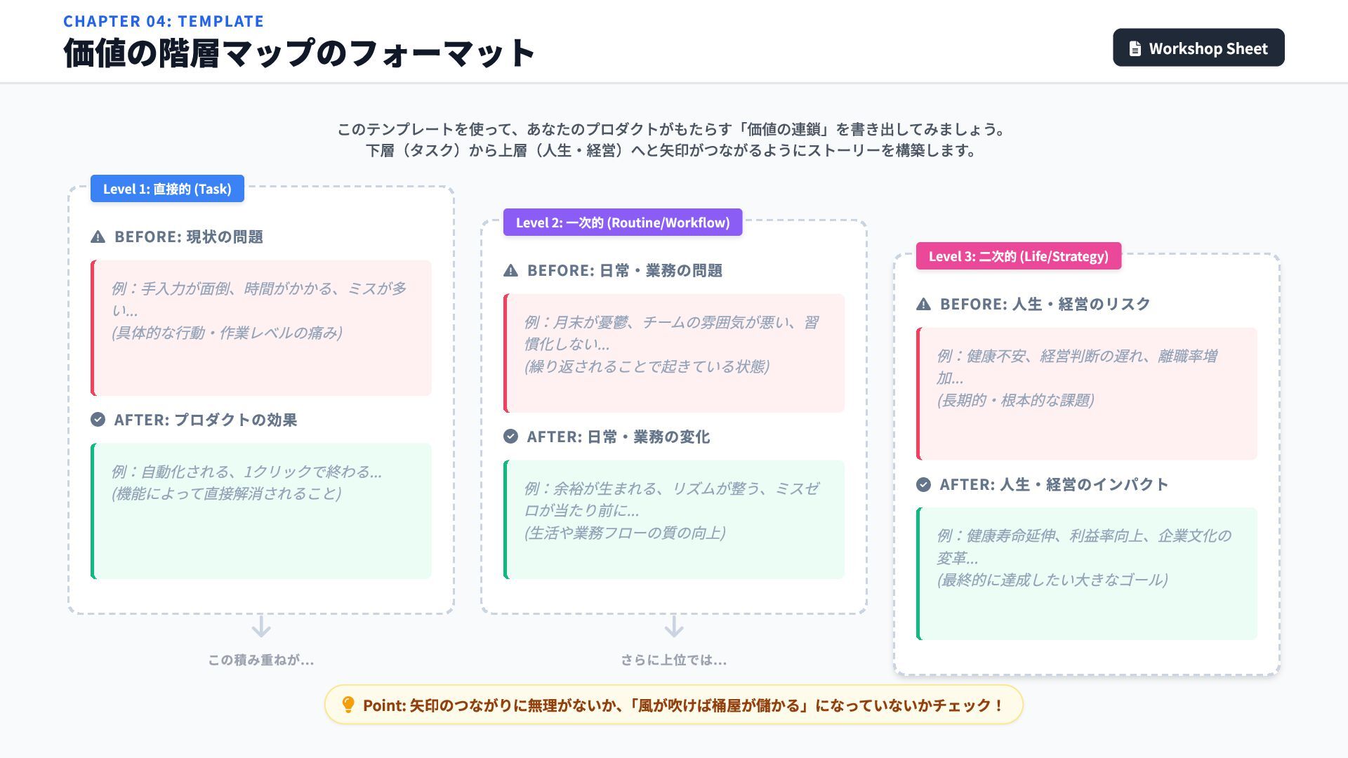 このテンプレートを使って、あなたのプロダクトがもたらす「価値の連鎖」を書き出してみましょう。 下層(タスク)から上層(人生・経営)へと矢印がつながるようにストーリーを構築します。 この積み重ねが... さらに上位では... Point: 矢印のつながりに無理がないか、 「風が吹けば桶屋が儲かる」になっていないかチェック! BEFORE: