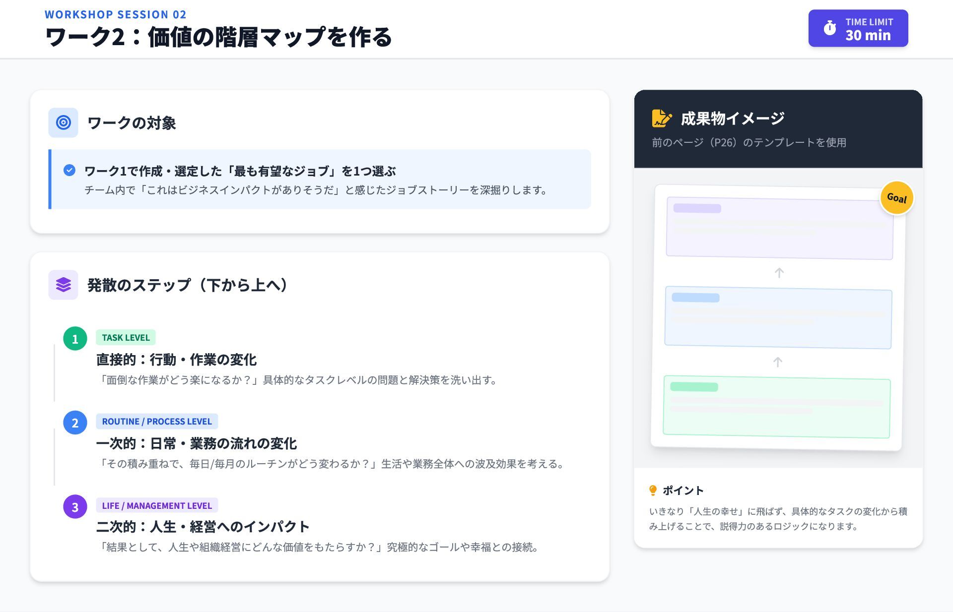 ポイント いきなり「人生の幸せ」に飛ばず、具体的なタスクの変化から積 み上げることで、説得力のあるロジックになります。 1 TASK LEVEL 直接的:行動・作業の変化 「面倒な作業がどう楽になるか?」具体的なタスクレベルの問題と解決策を洗い出す。 2 ROUTINE / PROCESS LEVEL 一次的:日常・業務の流れの変化 「その積み重ねで、毎日/毎月のルーチンがどう変わるか?」生活や業務全体への波及効果を考える。 3 LIFE / MANAGEMENT LEVEL 二次的:人生・経営へのインパクト 「結果として、人生や組織経営にどんな価値をもたらすか?」究極的なゴールや幸福との接続。 Goal WORKSHOP SESSION 02 ワーク2:価値の階層マップを作る 30 min TIME LIMIT