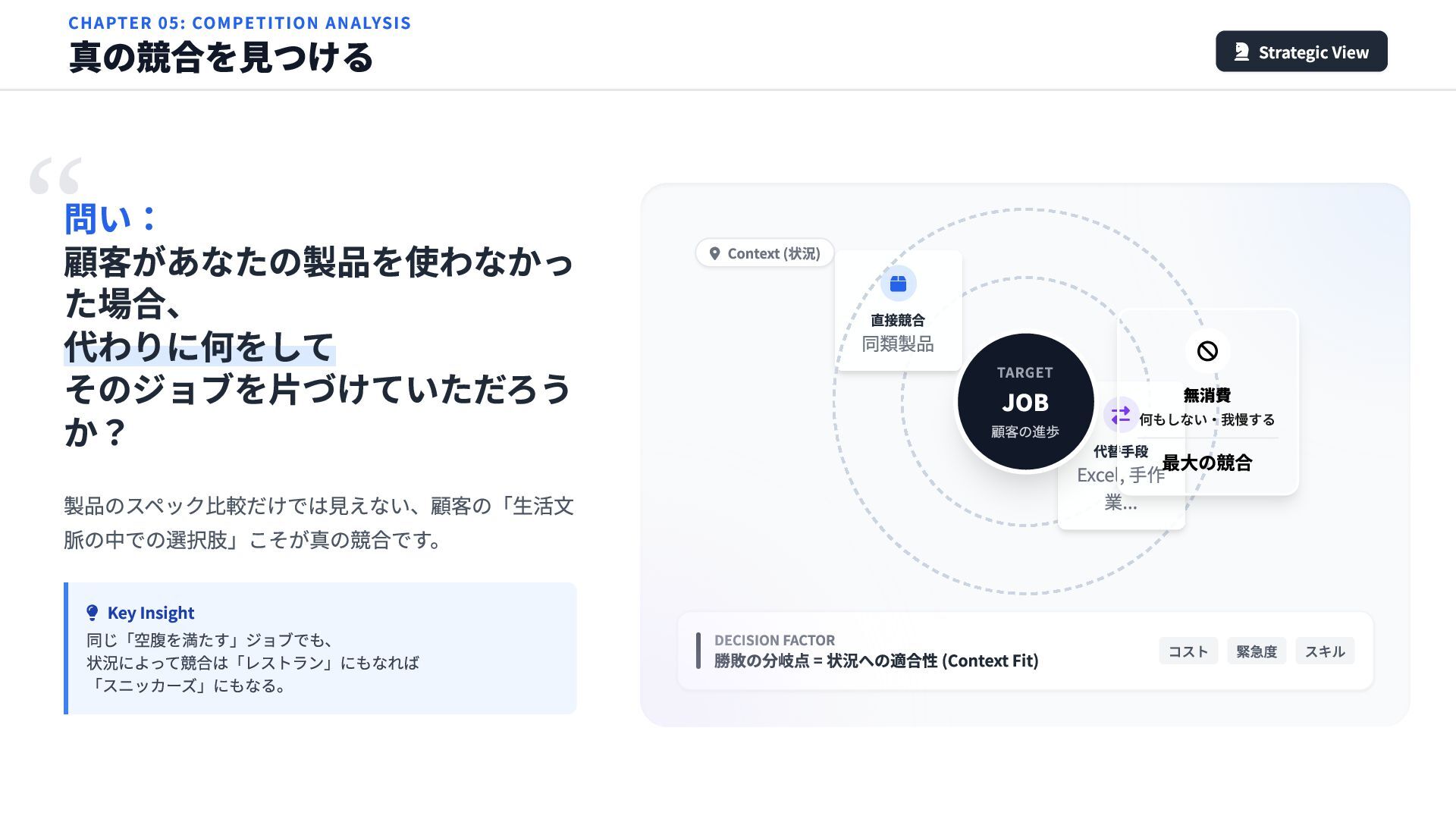 スキル CHAPTER 05: COMPETITION ANALYSIS 真の競合を見つける Strategic View 問い: 顧客があなたの製品を使わなかっ た場合、 代わりに何をして そのジョブを片づけていただろう か? 製品のスペック比較だけでは見えない、顧客の「生活文 脈の中での選択肢」こそが真の競合です。 Key Insight 同じ「空腹を満たす」ジョブでも、 状況によって競合は「レストラン」にもなれば 「スニッカーズ」にもなる。 Context (状況) 直接競合 同類製品 代替手段 Excel, 手作 業... TARGET JOB 顧客の進歩 無消費 最大の競合 何もしない・我慢する