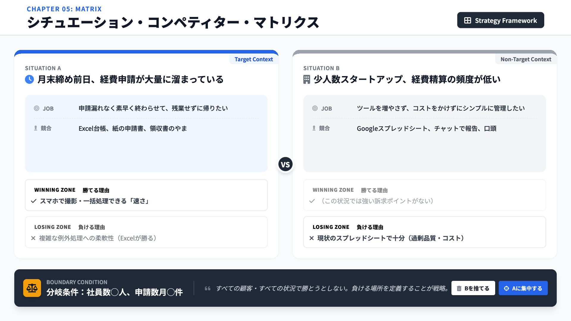 SITUATION A 月末締め前日、経費申請が大量に溜まっている JOB 申請漏れなく素早く終わらせて、残業せずに帰りたい 競合 Excel台帳、紙の申請書、領収書のやま WINNING ZONE 勝てる理由 スマホで撮影・一括処理できる「速さ」 Target Context LOSING ZONE 負ける理由 複雑な例外処理への柔軟性(Excelが勝る) SITUATION B 少人数スタートアップ、経費精算の頻度が低い JOB ツールを増やさず、コストをかけずにシンプルに管理したい 競合 Googleスプレッドシート、チャットで報告、口頭 LOSING ZONE 負ける理由 現状のスプレッドシートで十分(過剰品質・コスト) Non-Target Context WINNING ZONE 勝てる理由 (この状況では強い訴求ポイントがない) CHAPTER 05: MATRIX シチュエーション・コンペティター・マトリクス Strategy Framework VS
