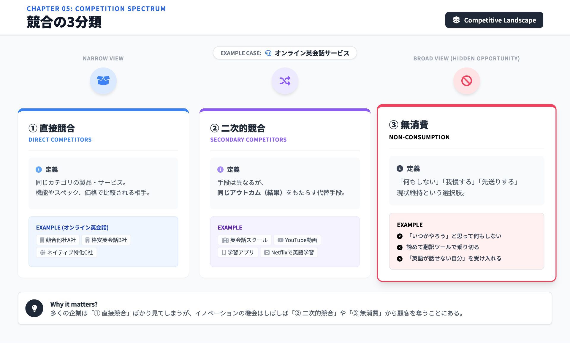 COMPETITION SPECTRUM 競合の3分類 Competitive Landscape ① 直接競合 DIRECT COMPETITORS 定義 同じカテゴリの製品・サービス。 機能やスペック、価格で比較される相手。 EXAMPLE (オンライン英会話) 競合他社A社 格安英会話B社 ネイティブ特化C社 NARROW VIEW ② 二次的競合 SECONDARY COMPETITORS 定義 手段は異なるが、 同じアウトカム(結果)をもたらす代替手段。 EXAMPLE 英会話スクール YouTube動画 学習アプリ Netflixで英語学習 BROAD VIEW (HIDDEN OPPORTUNITY) ③ 無消費 NON-CONSUMPTION 定義 「何もしない」 「我慢する」 「先送りする」 現状維持という選択肢。 EXAMPLE 「いつかやろう」と思って何もしない 諦めて翻訳ツールで乗り切る 「英語が話せない自分」を受け入れる BIGGEST COMPETITOR EXAMPLE CASE: オンライン英会話サービス