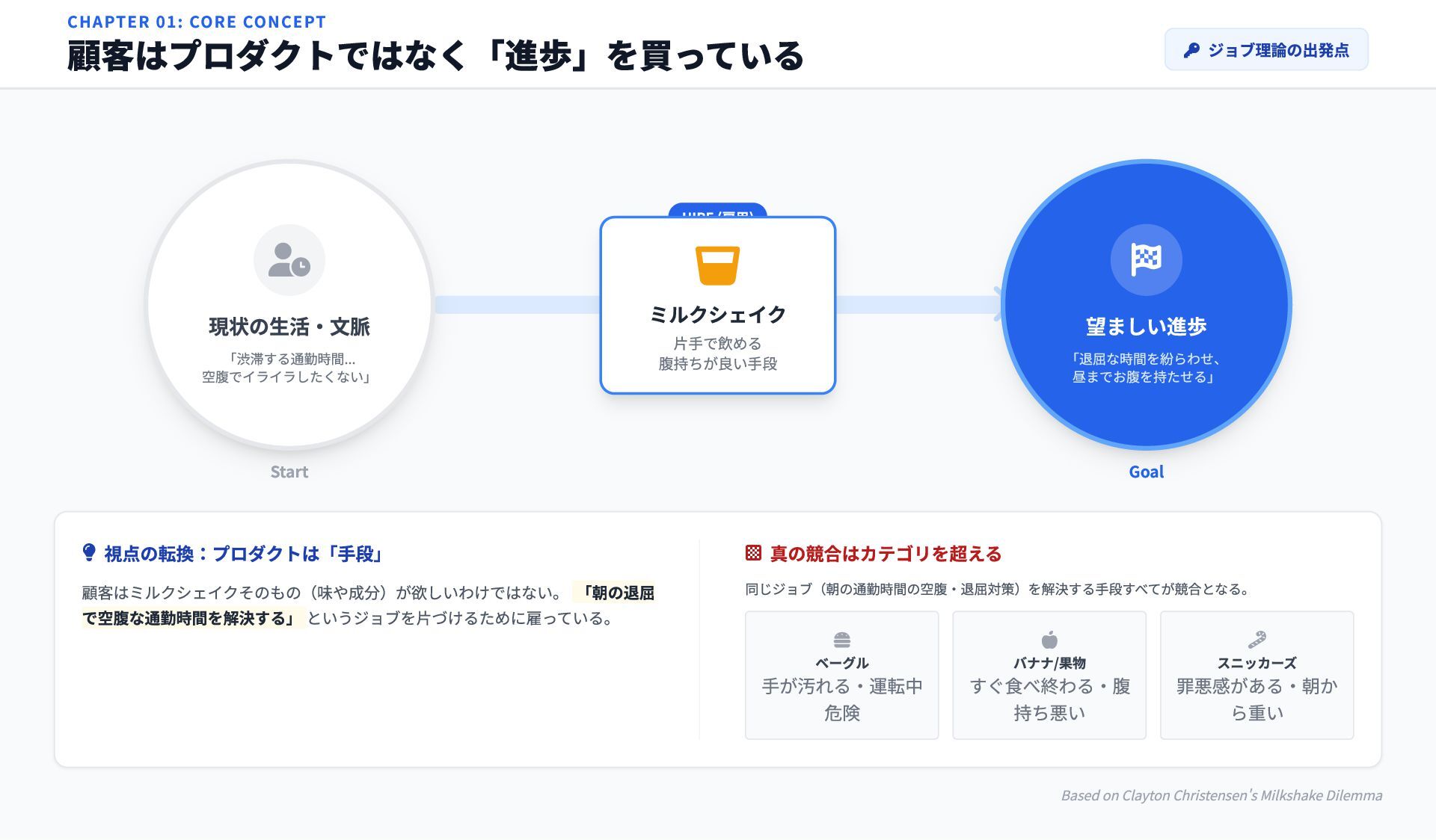 手が汚れる・運転中 危険 バナナ/果物 すぐ食べ終わる・腹 持ち悪い スニッカーズ 罪悪感がある・朝か ら重い Based on Clayton Christensen's Milkshake Dilemma HIRE (雇用) CHAPTER 01: CORE CONCEPT 顧客はプロダクトではなく「進歩」を買っている ジョブ理論の出発点 現状の生活・文脈 「渋滞する通勤時間... 空腹でイライラしたくない」 Start 望ましい進歩 「退屈な時間を紛らわせ、 昼までお腹を持たせる」 Goal ミルクシェイク 片手で飲める 腹持ちが良い手段