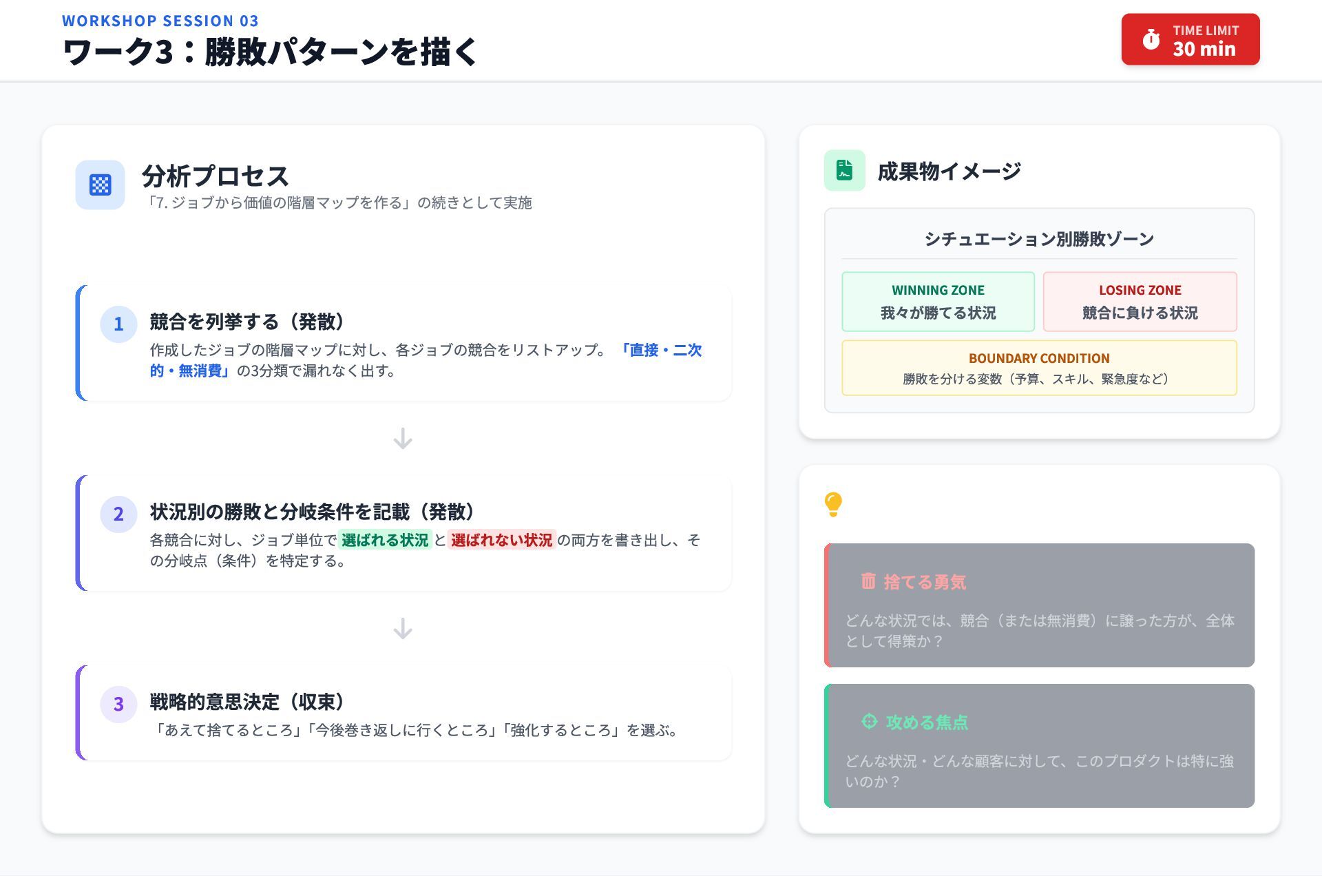 2 状況別の勝敗と分岐条件を記載(発散) 各競合に対し、ジョブ単位で選ばれる状況と選ばれない状況の両方を書き出し、そ の分岐点(条件)を特定する。 3 戦略的意思決定(収束) 「あえて捨てるところ」 「今後巻き返しに行くところ」 「強化するところ」を選ぶ。 成果物イメージ シチュエーション別勝敗ゾーン WINNING ZONE 我々が勝てる状況 LOSING ZONE 競合に負ける状況 BOUNDARY CONDITION 勝敗を分ける変数(予算、スキル、緊急度など) WORKSHOP SESSION 03 ワーク3:勝敗パターンを描く 30 min TIME LIMIT 判断のポイント 捨てる勇気 どんな状況では、競合(または無消費)に譲った方が、全体 として得策か? 攻める焦点 どんな状況・どんな顧客に対して、このプロダクトは特に強 いのか?