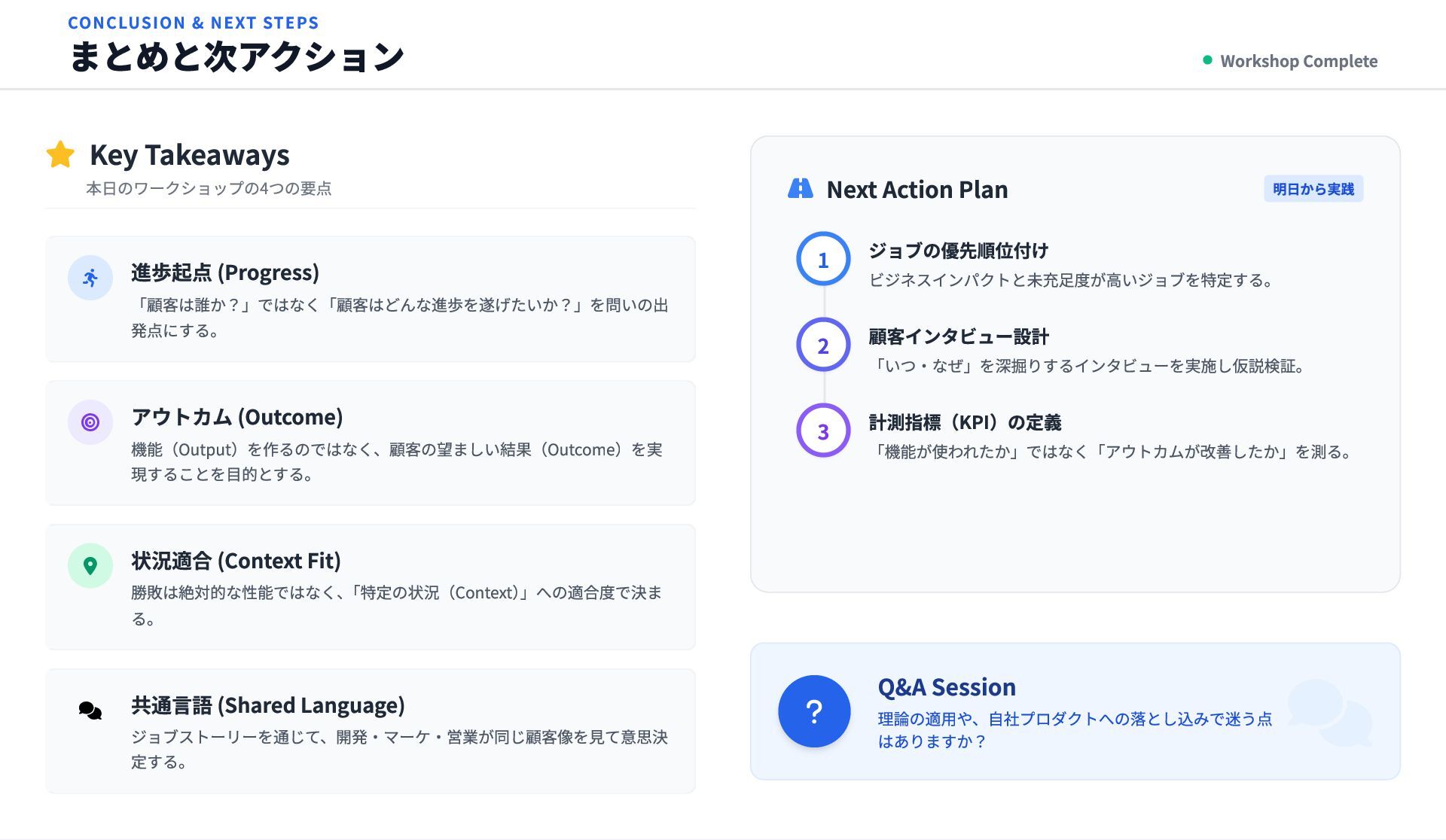 アウトカム (Outcome) 機能(Output)を作るのではなく、顧客の望ましい結果(Outcome)を実 現することを目的とする。 状況適合 (Context Fit) 勝敗は絶対的な性能ではなく、 「特定の状況(Context) 」への適合度で決ま る。 共通言語 (Shared Language) ジョブストーリーを通じて、開発・マーケ・営業が同じ顧客像を見て意思決 定する。 Next Action Plan 明日から実践 ? Q&A Session 理論の適用や、自社プロダクトへの落とし込みで迷う点 はありますか? CONCLUSION & NEXT STEPS まとめと次アクション Workshop Complete ジョブの優先順位付け ビジネスインパクトと未充足度が高いジョブを特定する。 1 顧客インタビュー設計 「いつ・なぜ」を深掘りするインタビューを実施し仮説検証。 2 計測指標(KPI)の定義 「機能が使われたか」ではなく「アウトカムが改善したか」を測る。 3