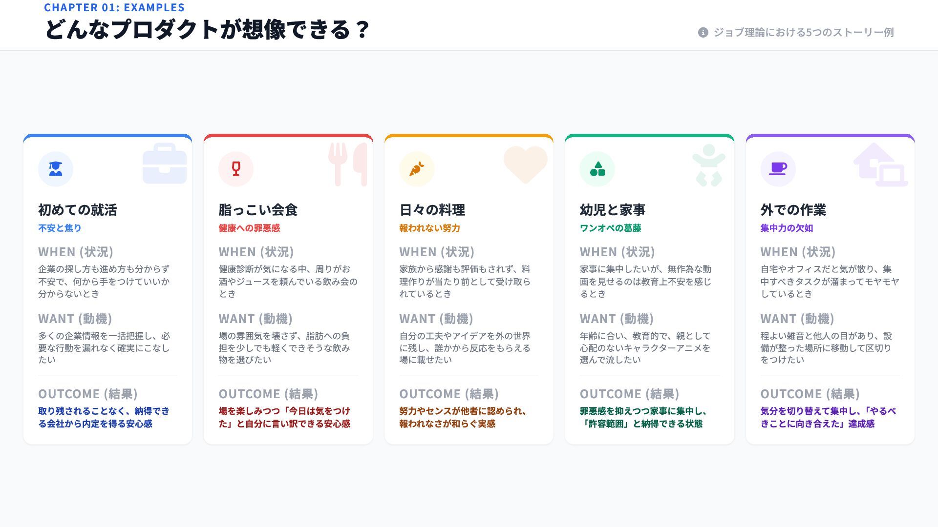 多くの企業情報を一括把握し、必 要な行動を漏れなく確実にこなし たい OUTCOME (結果) 取り残されることなく、納得でき る会社から内定を得る安心感 脂っこい会食 健康への罪悪感 WHEN (状況) 健康診断が気になる中、周りがお 酒やジュースを頼んでいる飲み会の とき WANT (動機) 場の雰囲気を壊さず、脂肪への負 担を少しでも軽くできそうな飲み 物を選びたい OUTCOME (結果) 場を楽しみつつ「今日は気をつけ た」と自分に言い訳できる安心感 日々の料理 報われない努力 WHEN (状況) 家族から感謝も評価もされず、料 理作りが当たり前として受け取ら れているとき WANT (動機) 自分の工夫やアイデアを外の世界 に残し、誰かから反応をもらえる 場に載せたい OUTCOME (結果) 努力やセンスが他者に認められ、 報われなさが和らぐ実感 幼児と家事 ワンオペの葛藤 WHEN (状況) 家事に集中したいが、無作為な動 画を見せるのは教育上不安を感じ るとき WANT (動機) 年齢に合い、教育的で、親として 心配のないキャラクターアニメを 選んで流したい OUTCOME (結果) 罪悪感を抑えつつ家事に集中し、 「許容範囲」と納得できる状態 外での作業 集中力の欠如 WHEN (状況) 自宅やオフィスだと気が散り、集 中すべきタスクが溜まってモヤモヤ しているとき WANT (動機) 程よい雑音と他人の目があり、設 備が整った場所に移動して区切り をつけたい OUTCOME (結果) 気分を切り替えて集中し、 「やるべ きことに向き合えた」達成感 CHAPTER 01: EXAMPLES どんなプロダクトが想像できる? ジョブ理論における5つのストーリー例